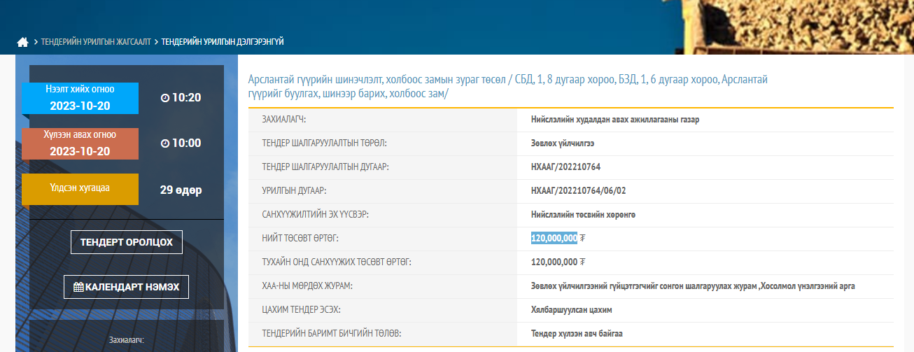 Тендерийг өчигдөр зарласан бөгөөд 10 дугаар сарын 20 хүртэл оролцогчдын санал хүлээн авч, тухайн өдрөө нээх аж.