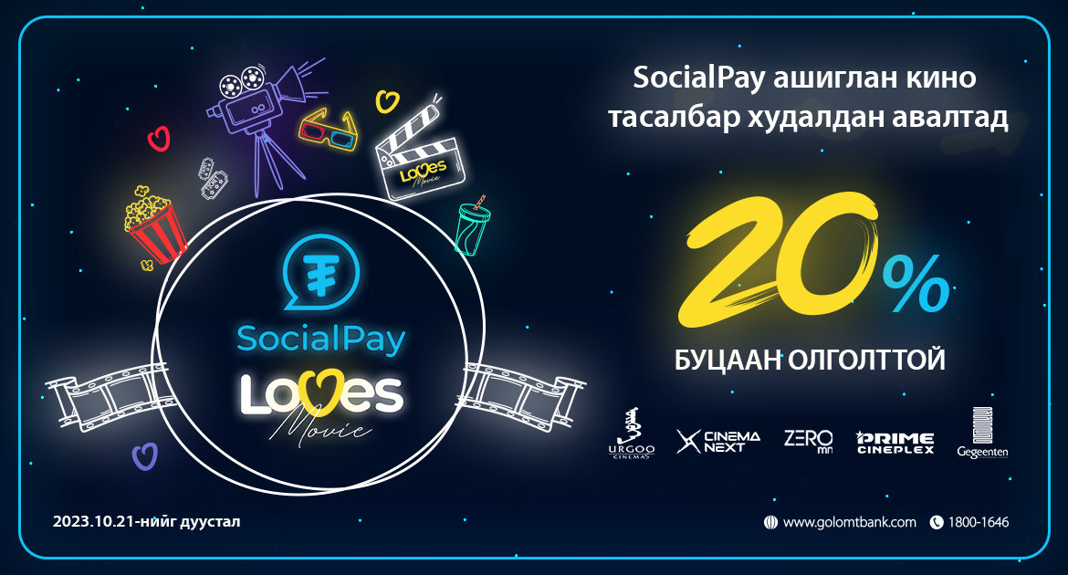 Хэрэглэгчдээ үргэлж хайрладаг SocialPay аппликэйшн энэ удаа таны чөлөөт цагийг үр бүтээлтэй өнгөрүүлэхэд анхааран “SocialPay Loves Movie”урамшуулалт аяныг эхлүүлж байна. Та 2023.10.21-нийг дуустал дараах кино театруудад үзвэр үзэхдээ SocialPay-ээр тасалбар худалдан аваад 20%-ийн буцаан олголт авах боломжтой.