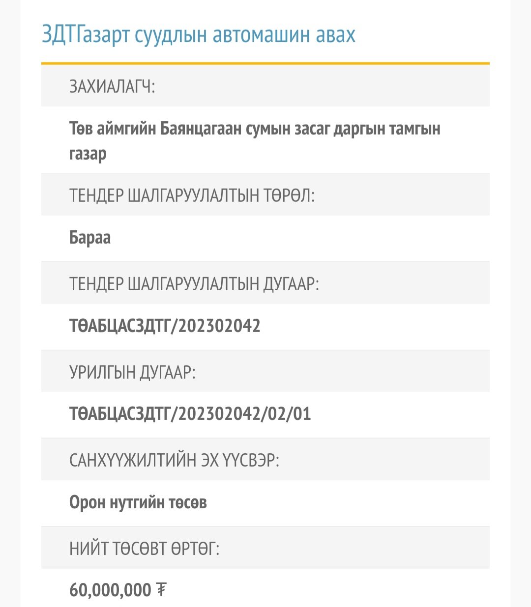 Төв аймгийн Баянцагаан сумын ЗДТГ 60 саяар автомашин авна