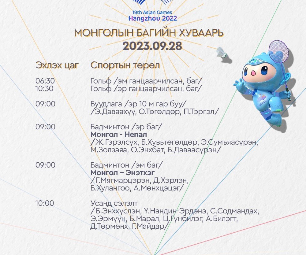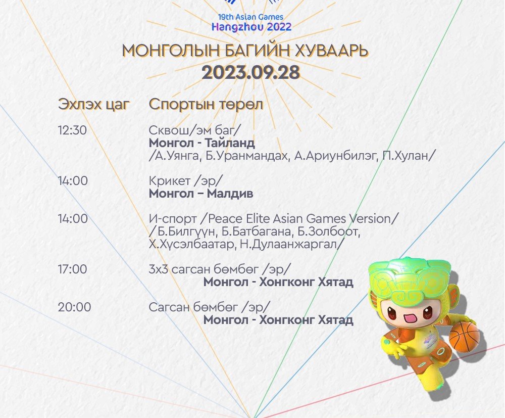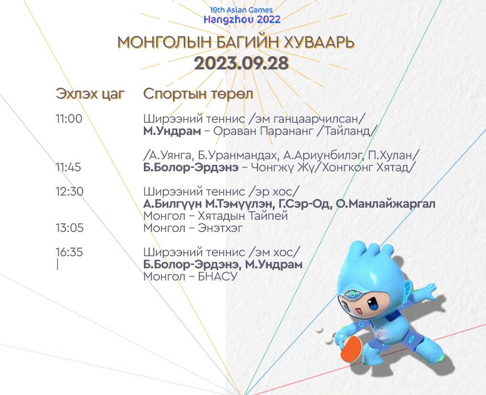 Ханжоу 2022 Азийн наадмын Монголын баг тамирчдын тоглолтын /2023.09.28/ өнөөдрийн хуваарийг танилцуулж байна. Өнөөдөр тамирчид гольф, буудлага, бадминтон, усанд сэлэлт, ширээний теннис, сквош, и-спорт, 3х3 сагсан бөмбөг зэрэг төрлүүдээр өрсөлдөх юм.
