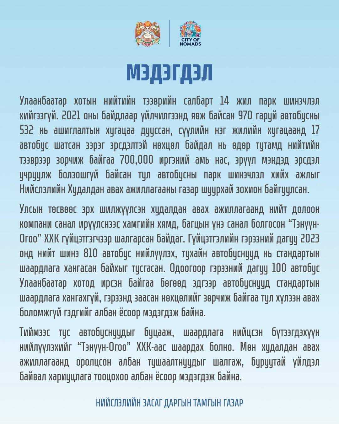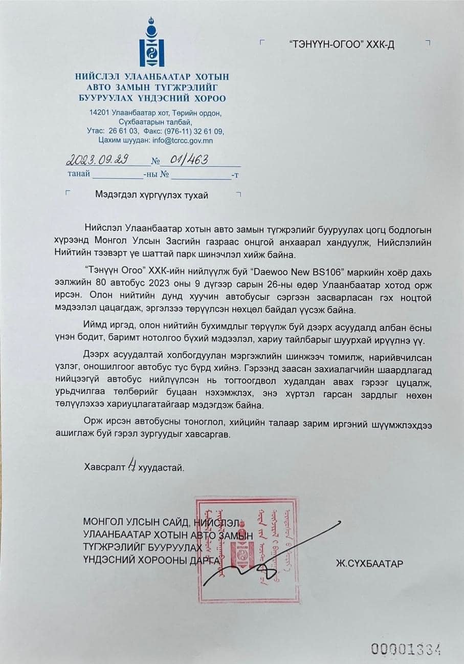 Түүний араас нийслэлийн Засаг дарга Д.Сумъяабазар мөн л Тэнүүн Огоо ХХК руу мэдэгдэл явуулж, хэл ам дагуулсан автобусуудыг чинь хүлээж авахгүй хэмээн даналзаж, стандартын шаардлага хангасан автобус шаардав. Хотын удирдлагын мэдэгдэлд “Мөн худалдан авах ажиллагаанд оролцсон албан тушаалтнуудыг шалгаж, буруутай үйлдэл байвал хариуцлага тооцно” гэжээ.
