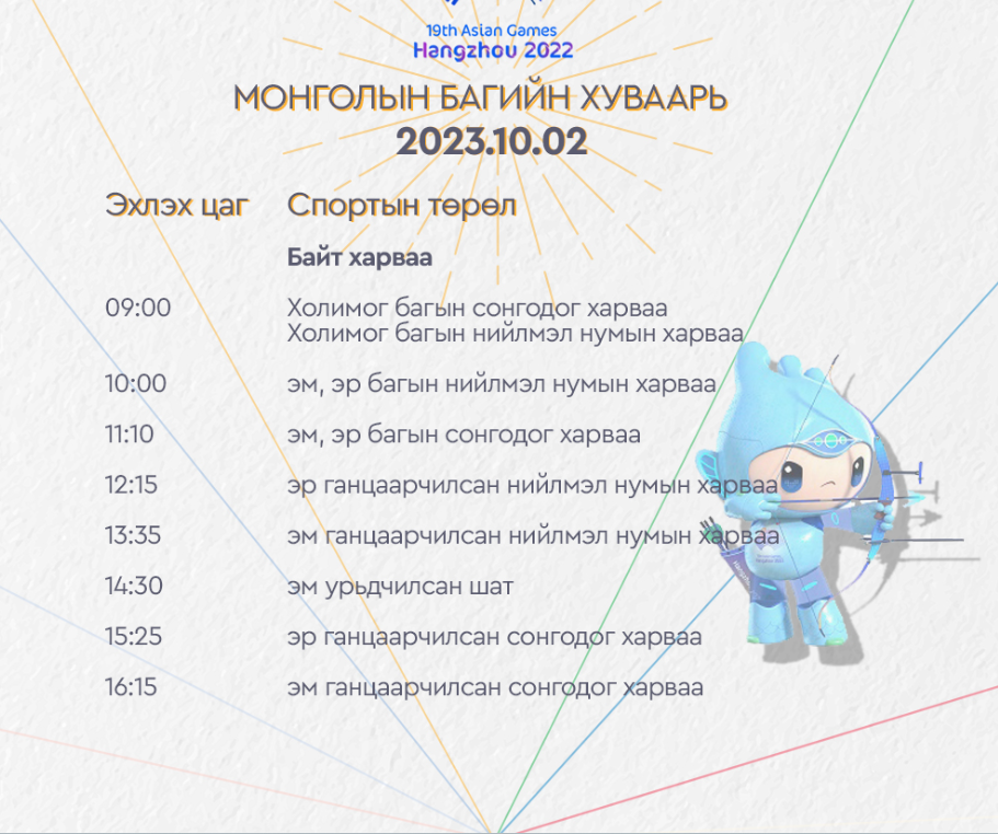 Ханжоу-2022: Монголын баг тамирчдын тоглолтын хуваарь