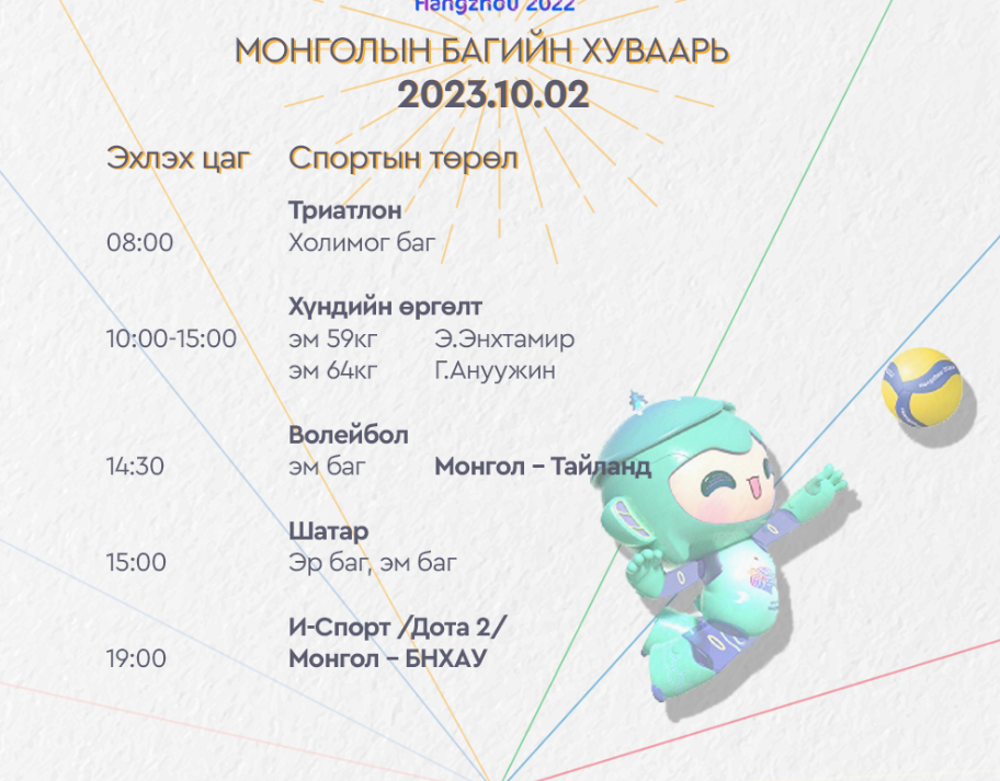 Ханжоу 2022 Азийн наадмын Монголын баг тамирчдын тоглолтын /2023.10.02/ өнөөдрийн хуваарийг танилцуулж байна. Өнөөдөр тамирчид триатлон, хүндийн өргөлт, волейбол, шатар, и-спорт зэрэг төрлүүдээр өрсөлдөх юм.