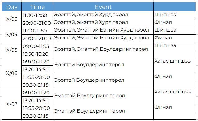 Тэмцээн 10 дугаар сарын 03-07-ны өдрүүдэд “Shaoxing Keqiao Yangshan” спорт авиралтын төвд болох бөгөөд та бүхэн Тэнгэр телевизээс шууд хүлээн авч үзээрэй.