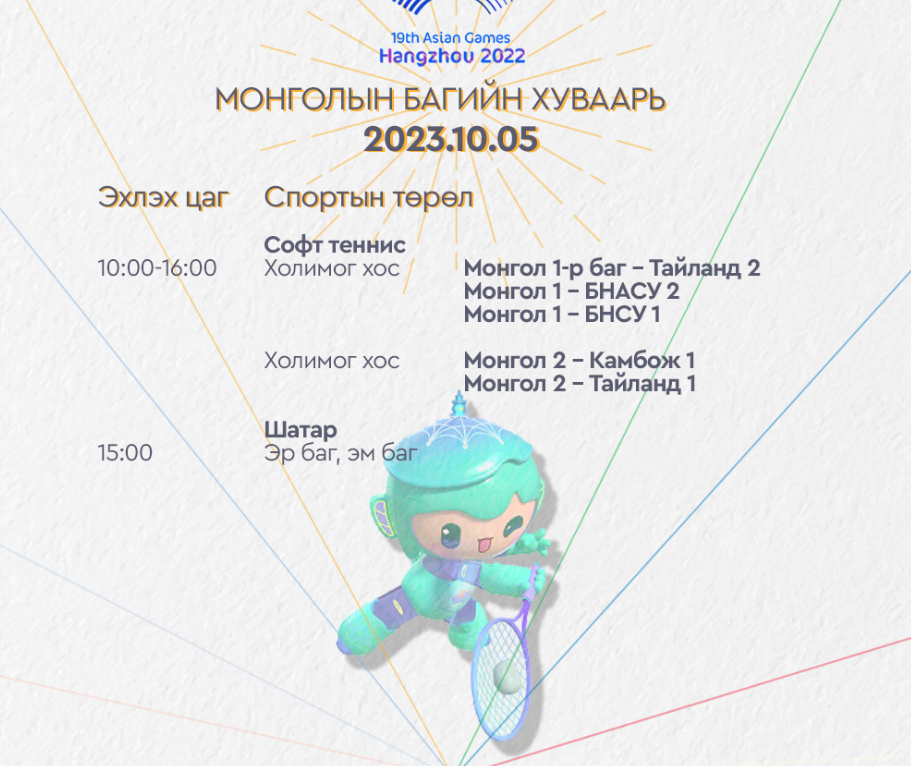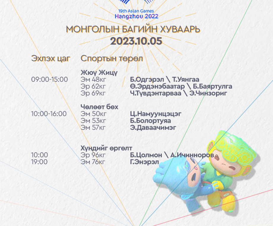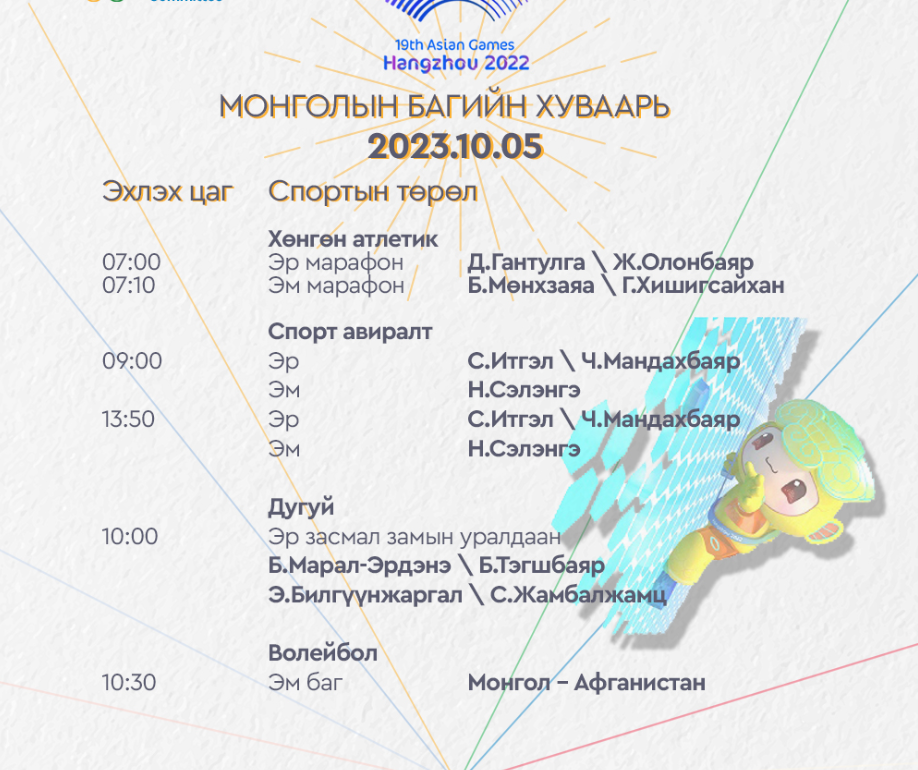Ханжоу 2022 Азийн наадмын Монголын баг тамирчдын тоглолтын /2023.10.05/ өнөөдрийн хуваарийг танилцуулж байна. Өнөөдөр тамирчид хөнгөн атлетик, спорт авиралт, дугуй, волейбол, софт теннис, шатар, жюү жицү, чөлөөт бөх, хүндийг өргөлт зэрэг төрлүүдээр өрсөлдөх юм.
