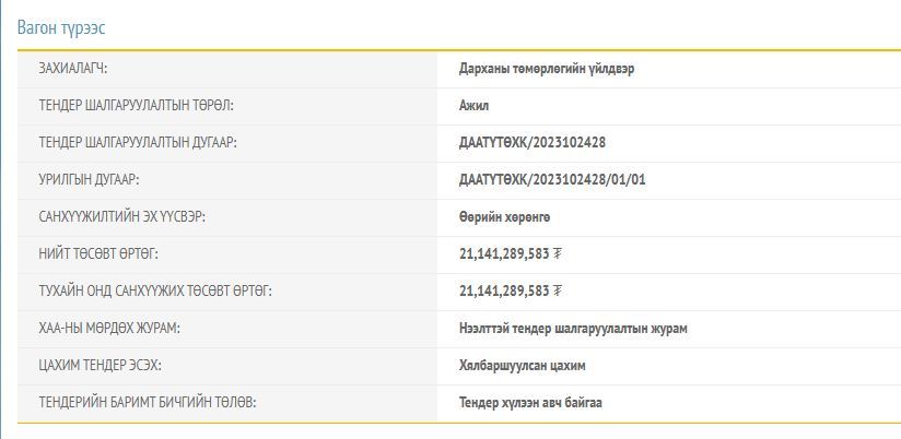 Тэгвэл Дарханы төмөрлөгийн үйлдвэр өөрийн хөрөнгөөр авсан вагонаа эргүүлэн авах талаар үйл ажиллагаа зогсонги байдалд орсон бололтой. Учир нь тус үйлдвэрээс воган түрээслэхээр тендер зарласан байна. Тендерийн төсөвт өртөг 21 тэрбум төгрөг байна. Ийнхүү өөрийн хөрөнгө бусдад өгчихөөд өөрөө түрээслэх вагон хайж байгаа төр хийгээд түүний үйлдвэрийн түүх үргэлжилсээр....