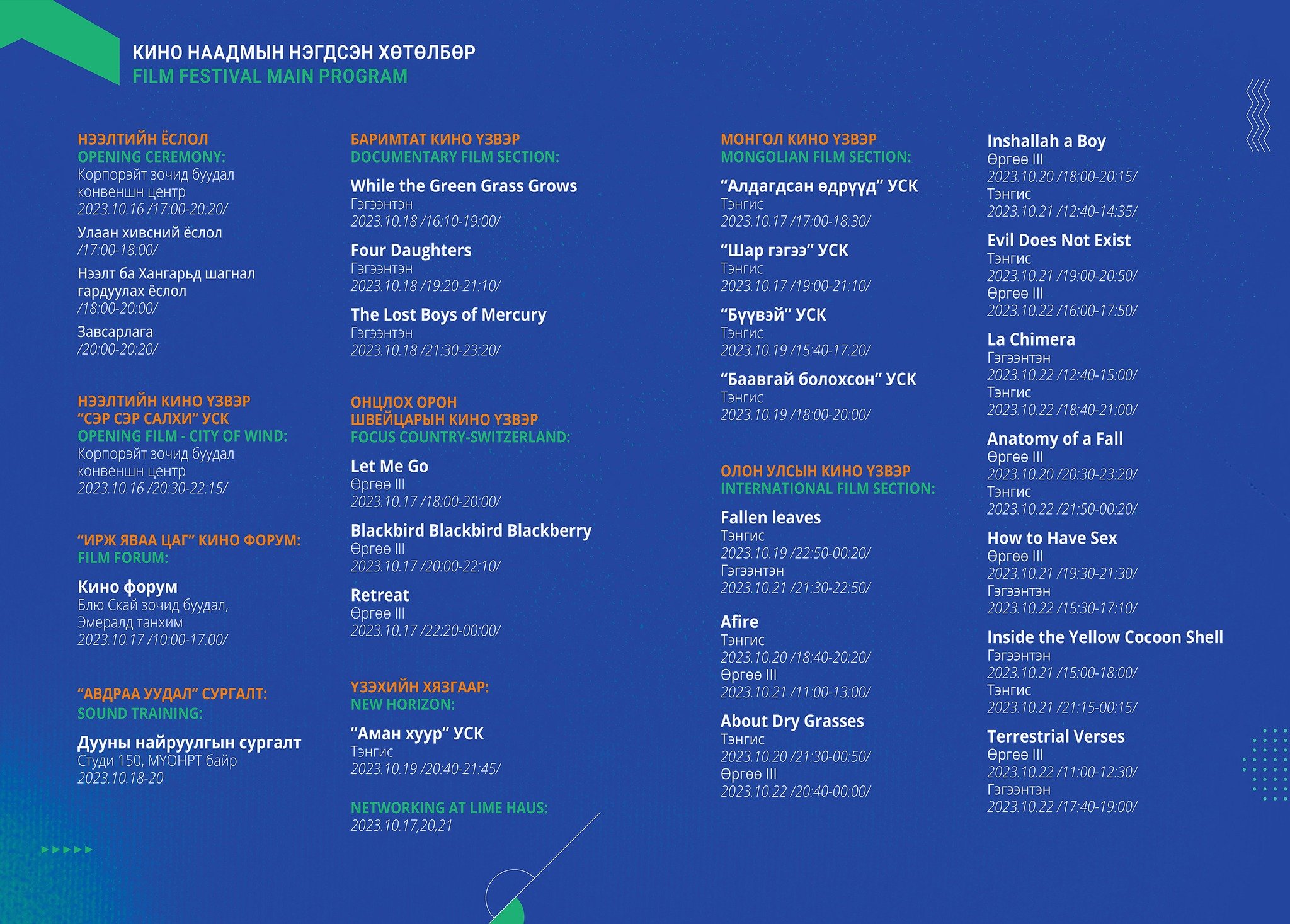 Энэ жилийн хувьд олон улсын 10, онцлох орон болох Швейцарын, баримтат гурав, Монголын дөрөв, “Үзэхийн хязгаар” хэсэгт багтсан нэг болон нээлтийн үзвэр зэрэг нийт 22 уран бүтээлийг үзэгчид “Тэнгис”, “Өргөө”, “Гэгээнтэн” гэсэн гурван кино театрын дэлгэцээр хүлээн авах боломжтой.