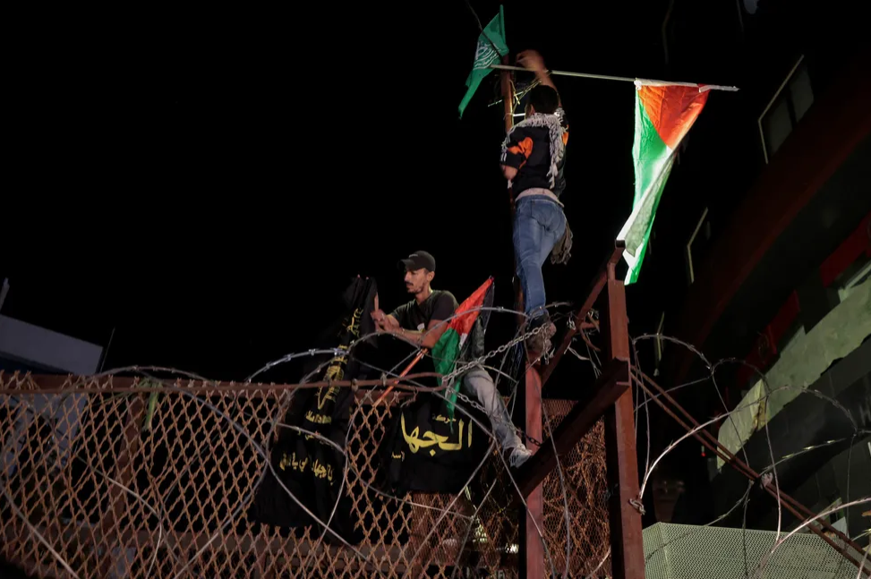 Жагсагчдын ихэнх нь гартаа Палестины далбааг барьсан байсан бөгөөд тэд Америкийн Элчин сайдын яамны хашаа руу авирчээ.