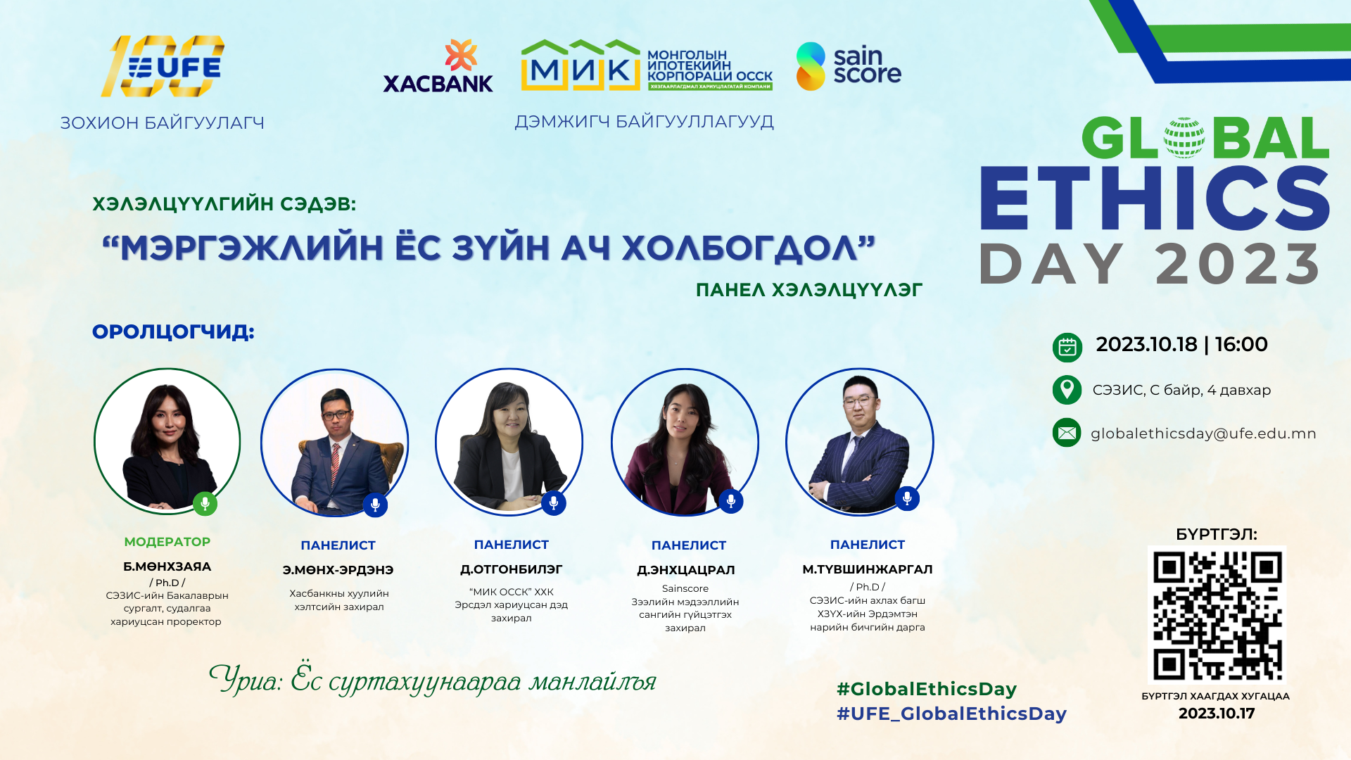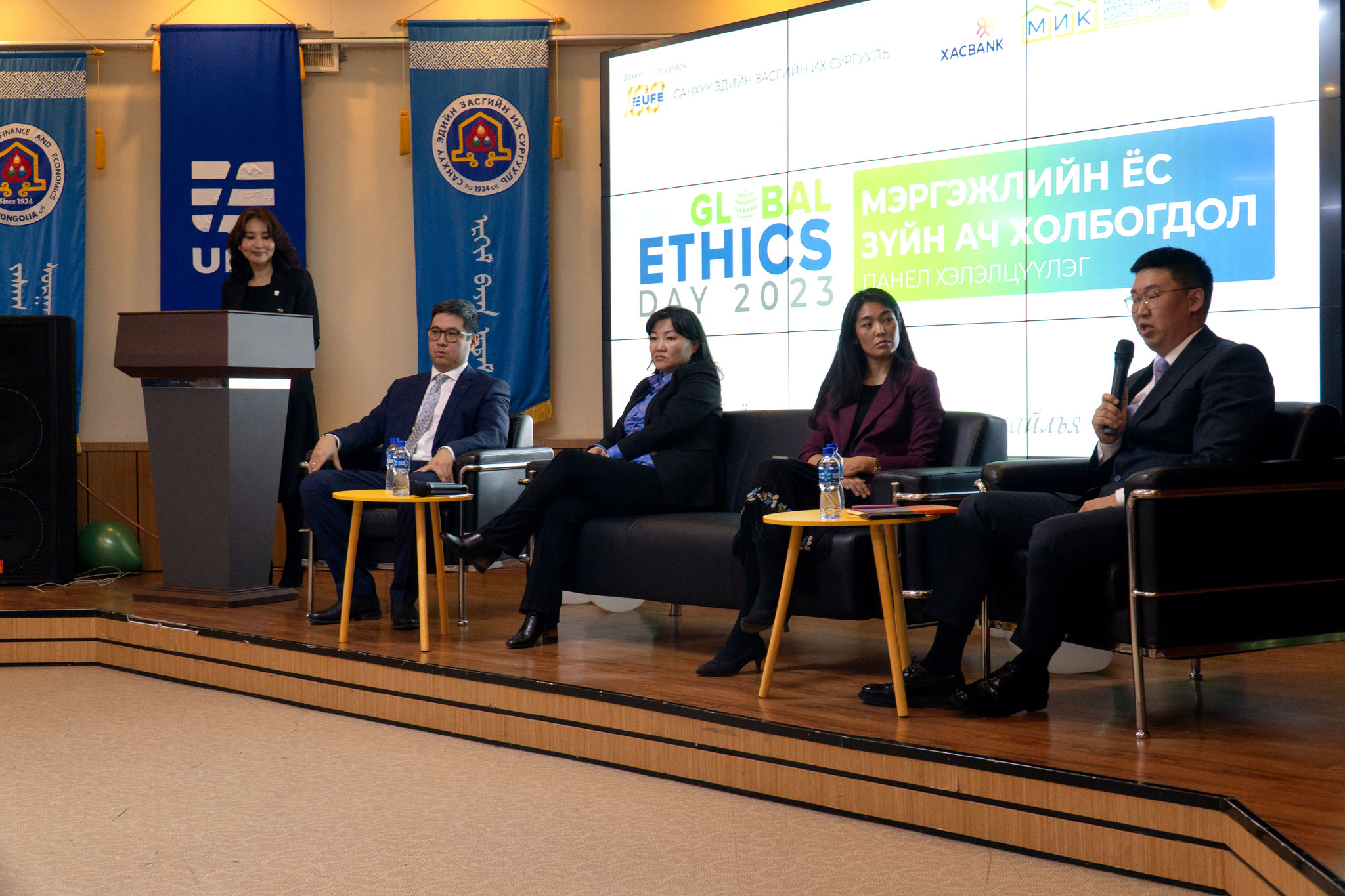 “Дэлхийн ёс зүйн өдөр”-өөр ёс зүй, ёс суртахууны ойлголтыг хувь хүний түвшнээс эхлэн байгууллага, улс орны түвшинд хүртэл авч үзэн, олон нийтийн ойлголтыг нэмэгдүүлэх төрөл бүрийн үйл ажиллагааг зохион байгуулдаг. “Мэргэжлийн ёс зүйн ач холбогдол” олон нийтийг хамарсан СЭЗИС-ийн ЭЗТ-ийн ахлах багш, Хууль зүйн үндэсний хүрээлэнгийн эрдэмтэн нарийн бичгийн дарга, доктор М.Түвшинжаргал, “Монголын ипотекийн корпораци ОССК” ХХК-ийн эрсдэл хариуцсан дэд захирал Д.Отгонбилэг, ХасБанкны хуулийн хэлтсийн захирал, Э.Мөнх-эрдэнэ, зээлийн мэдээллийн сангийн гүйцэтгэх захирал Д.Энхцацрал, нар панелистаар оролцож, мэргэжлийн ёс зүйн тухай яриа өрнүүллээ.