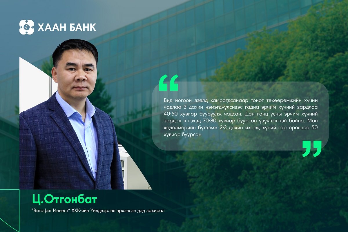 “Бид ногоон зээлд хамрагдсанаар тоног төхөөрөмжийн хүчин чадлаа 3 дахин нэмэгдүүлснээс гадна эрчим хүчний зардлаа 40-50 хувиар бууруулж чадсан. Дан ганц усны эрчим хүчний зардал л гэхэд 70-80 хувиар буурсан үзүүлэлттэй байна. Мөн хөдөлмөрийн бүтээмж 2-3 дахин ихсэж, хүний гар оролцоо 50 хувиар буурсан” хэмээн “Витафит Инвест” ХХК-ийн Үйлдвэрлэл эрхэлсэн дэд захирал Ц.Отгонбат онцолж байна.