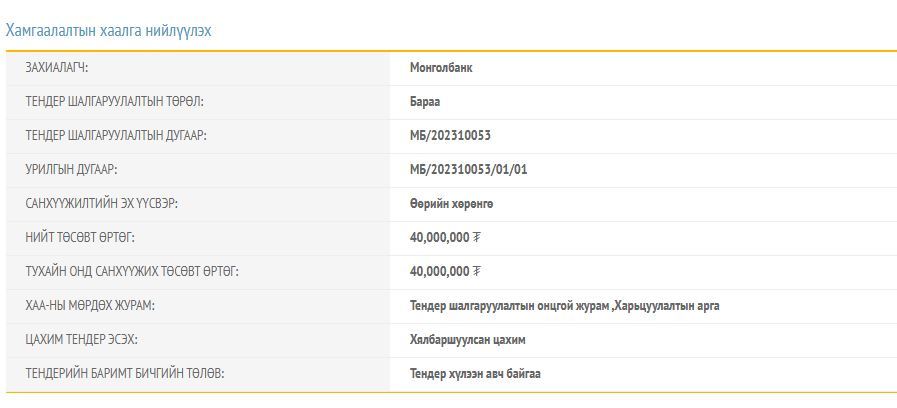 Тэгвэл дээрх худалдан авалтын төлөвлөгөөнд багтаагүй тендерийг тус банкнаас зарласан байна. Тодруулбал, Монголбанкны “А” байрны хаалгыг шинэчлэхээр болсон байна. Ингэхдээ хамгаалалтын хаалга гэх нэрээр 30 сая төгрөгийн тендер зарлажээ.