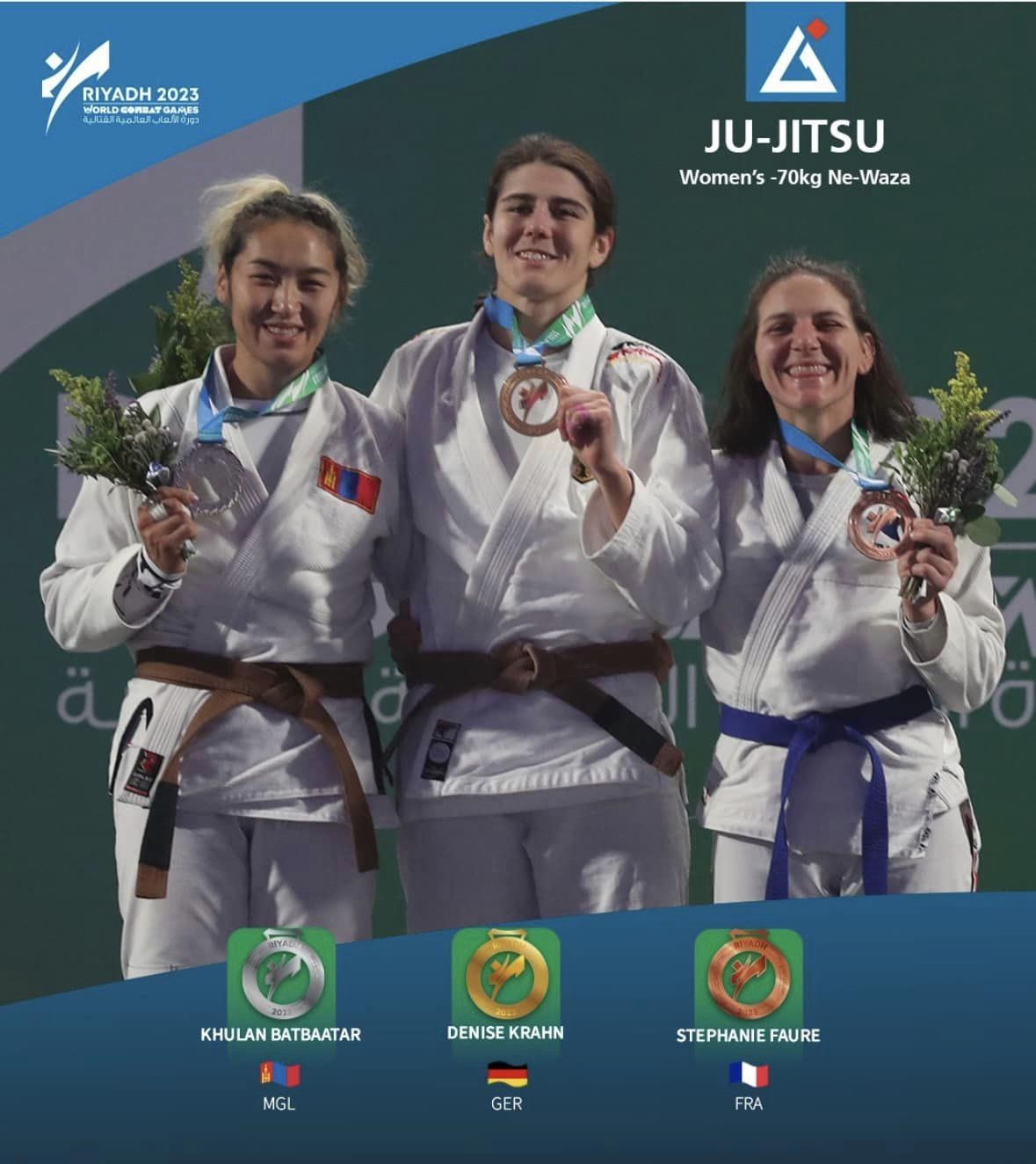 Саудын Арабын Рияадх хотод “Дэлхийн тулааны наадам” үргэлжилж байна. Спортын 16 төрлөөр зохион байгуулагдаж буй тус наадмын жюү жицүгийн -70 кг-ын жинд өрсөлдсөн “Thunder bjj” академийн дасгалжуулагч Б.Хулан мөнгөн медаль хүртлээ. Тэрбээр эхний тойрогтоо Германы тамирчинг оноогоор ялж, 2-р тойрогт Ангол улсын тамирчинг цэвэр, хэсгийн аваргын төлөө Франц улсын тамирчинтай барилдаж идэвхийн оноогоор ялснаар аваргын төлөө шалгарсан. Харин аваргын төлөө Германы тамирчинтай барилдаж ялагдснаар “World Combat Games-2023”-ын мөнгөн медальтан болсон юм.