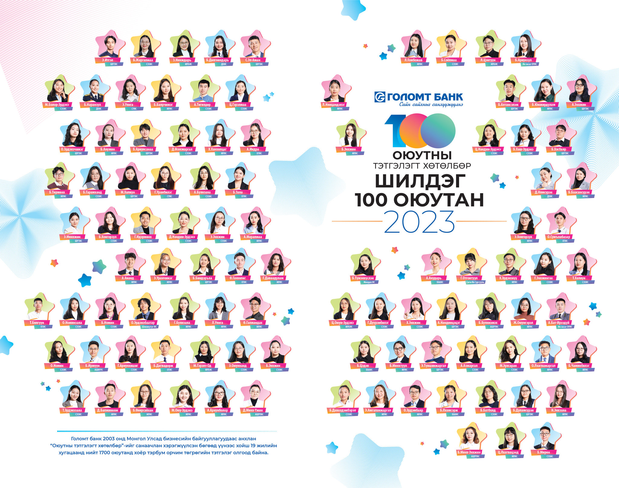 Боловсролыг дэмжигч Голомт банкнаас жил бүр зохион байгуулдаг “Оюутны тэтгэлэгт хөтөлбөр”-ийн шилдэг 100 оюутныг тодруулан зарлалаа. Тэтгэлэгт шалгарсан шилдгийн шилдэг оюутнуудад батламж болон мөнгөн тэтгэлэг гардуулах ёслолын ажиллагаа энэ оны 10-р сарын 27-ны өдөр болсон юм.