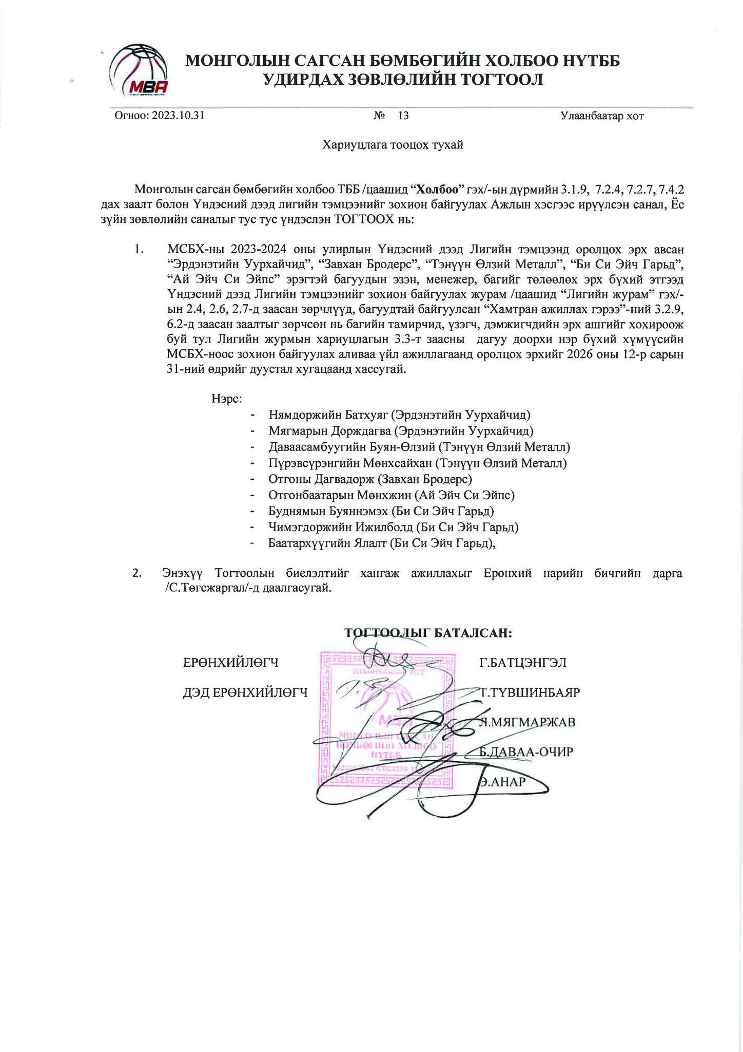 Тодруулбал, Erdenet Miners, ВСН Garid, Тэнүүн-Өлзий Металл, Zavkhan Brothers, IHC Apes гэсэн эрэгтэй таван багийн эзэд, менежер, төлөөлөх эрх бүхий этгээдүүдийг Үндэсний дээд Лигийн тэмцээнийг зохион байгуулах журмын 2.4, 2.6, 2.7-д заасан зөрчлүүд, багуудтай байгуулсан "Хамтран ажиллах гэрээ"-ний 3.2.9, 6.2-д заасан заалтыг зөрчсөн нь багийн тамирчид, үзэгч, дэмжигчдийн эрх ашгийг хохироож буй тул Лигийн журмын хариуцлагын 3.3-т заасны дагуу доорхи нэр бүхий хүмүүсийн МСБХ-ноос зохион байгуулах аливаа үйл ажиллагаанд оролцох эрхийг 2026 оны 12-р сарын 31-ний өдрийг дуустал хугацаанд хасахаар шийдвэрлэлээ.