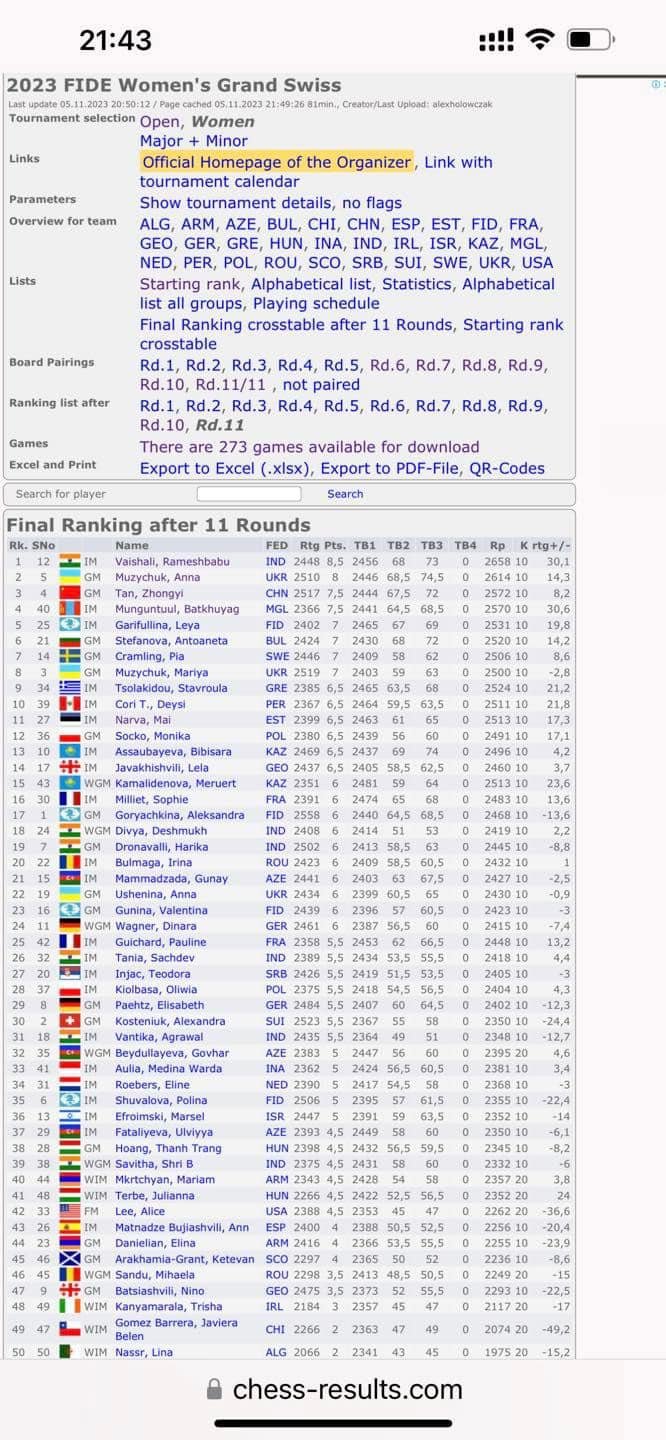 Их Британийн Мэн арлын Дуглас хотод шатрын “FIDE Women grand swiss” тэмцээн 10 дугаар сарын 25-наас 11 дүгээр сарын 5-ны өдрүүдэд боллоо.