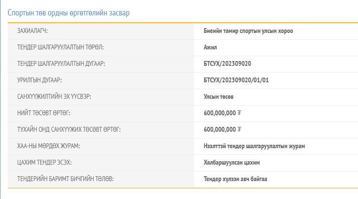 Мэргэжлийн хяналтын ерөнхий газраас акталсан гэгддэг 65 жилийн настай Спортын төв ордны өргөтгөлийн хэсэгт засвар хийхээр болсон байна. Энэхүү тендер нь 600 сая төгрөгийн төсөв өртөгтэй. Биеийн тамир, спортын улсын хорооны захиалгатай энэхүү ажлыг улсын төсвөөс санхүүжүүлэх юм.