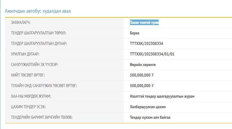 Тавантолгой түлш ХХК 500 сая төгрөгөөр автобус авахаар төлөвлөөгүй тендер зарлалаа