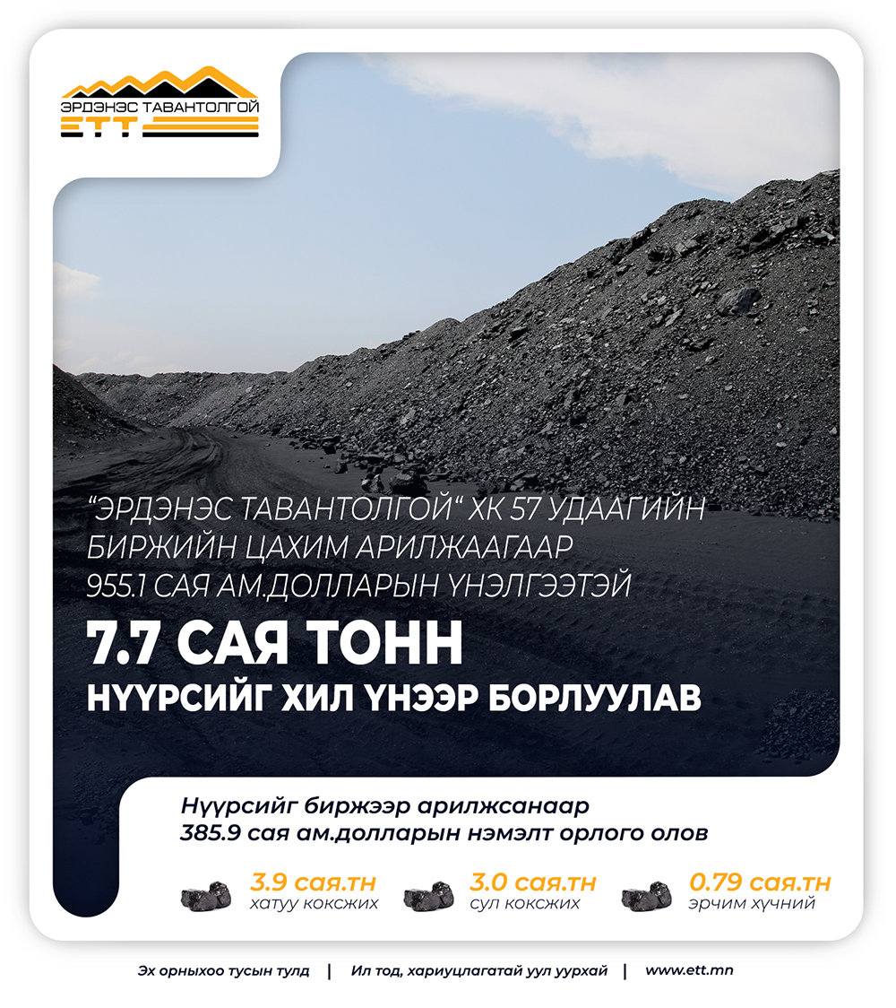 “Эрдэнэс Тавантолгой” ХК 2023 оны 2 дугаар сарын 9-ний өдрөөс өнөөдрийг хүртэл хугацаанд нийт 57 биржийн цахим арилжаа зохион байгуулж, 955.1 сая долларын үнэлгээтэй 7.7 сая тонн нүүрсийг хилийн үнээр борлуулаад байна. Үүнээс 3.9 сая тонн нүүрс нь хатуу коксжих чанартай нүүрс, 3.0 сая тонн нүүрс нь сул коксжих нүүрс, 0.79 сая тонн эрчим хүчний нүүрс байна. Нүүрсийг биржээр арилжсанаар 385.9 сая ам долларын нэмэлт орлого олоод байна.