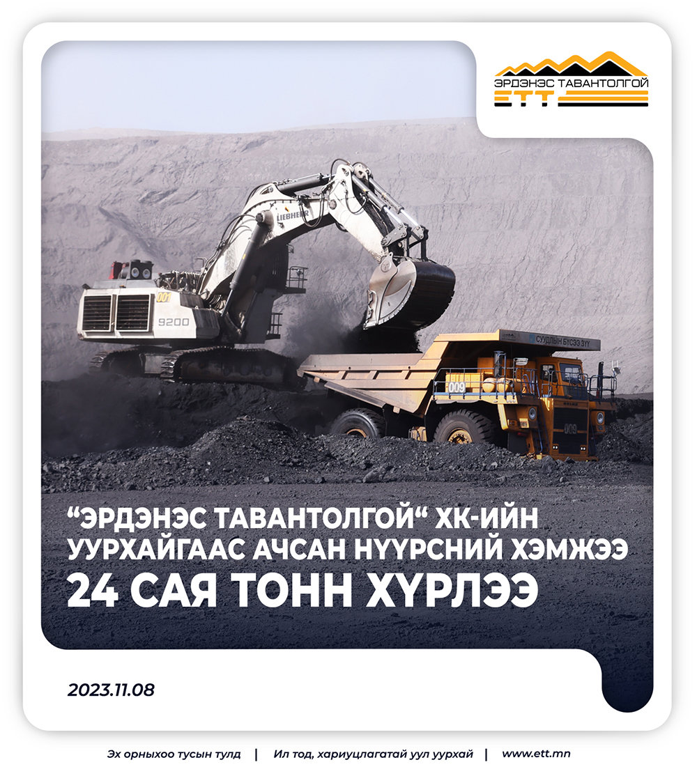 “Эрдэнэс Тавантолгой” ХК -ийн уухайгаас ачсан нүүрсний хэмжээ 2023 оны 11 дүгээр сарын 08-ны өдрийн байдлаар 24 сая тоннд хүрлээ. 2023 оны төгсгөлд 30 сая тонн нүүрс экспортлох зорилт дэвшүүлэн уулын ажлын төлөвлөгөө боловсруулж, борлуулалтыг нэмэгдүүлэн ажиллаж байна.