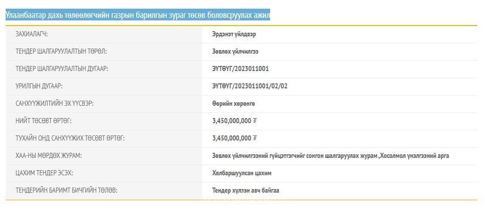 Тодруулбал, Уулын баяжуулах Эрдэнэт үйлдвэр Улаанбаатар тусгайлан оффисын барилга барихаар төлөвлөсөн байна. Энэ төлөвлөгөөгөө хэрэгжүүлэхээр 3.4 тэрбум төгрөгийн өртөг бүхий тендер зарласан байна. Тендерийн баримт бичигт тусгаснаар тус үйлдвэр Улаанбаатар дахь төлөөлөгчийн газрын барилгын зураг төсөв боловсруулах ажилд дээр хөрөнгийг зарцуулах гэнэ. Ийнхүү нийслэлд тун удахгүй Эрдэнэт үйлдвэрийн гэх ОФФИСЫН барилга сүндэрлэх нь ээ.