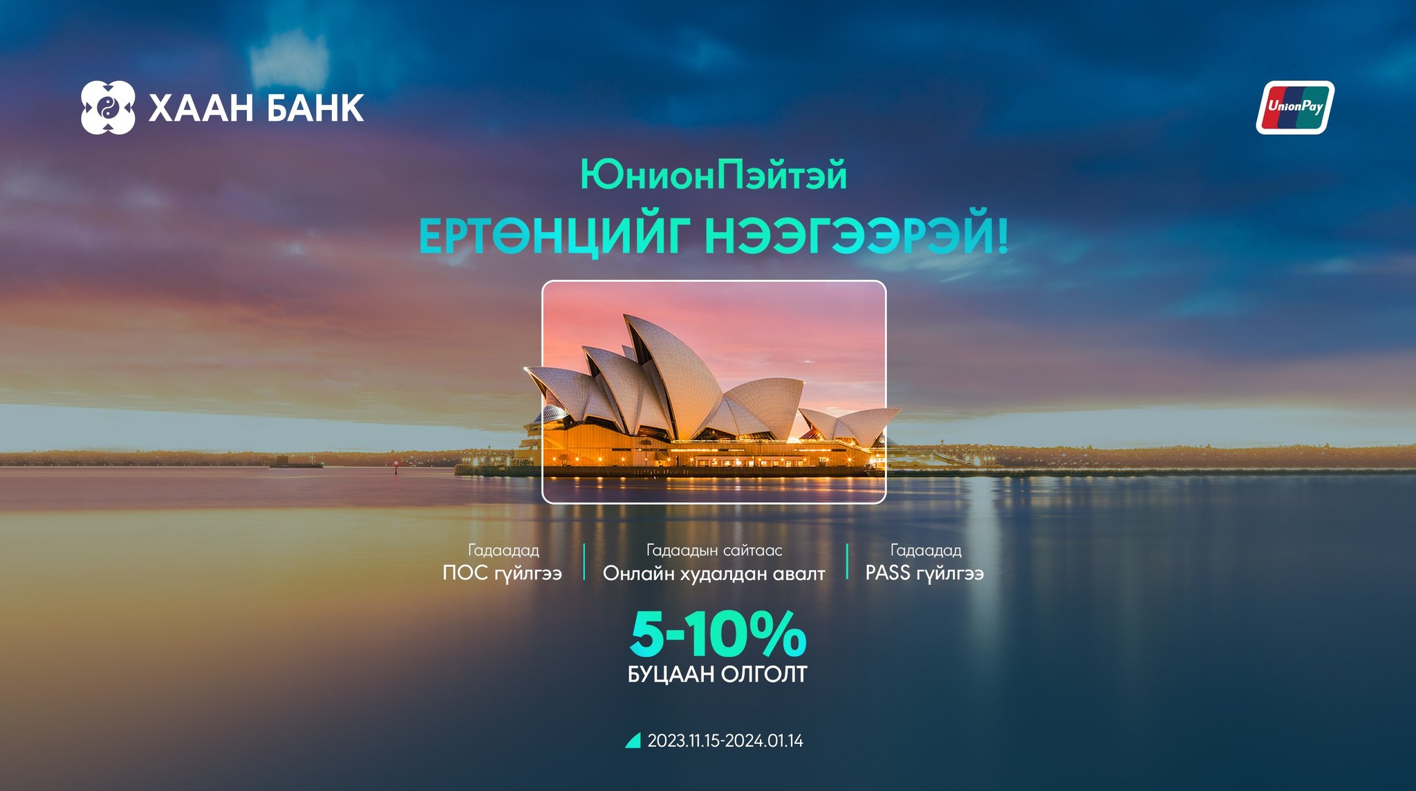2023.11.15-2024.01.14-ний өдрийг дуустал үргэлжлэх энэхүү урамшуулалт аяны хугацаанд ХААН Банкны ЮнионПэй карттай эрхэм харилцагч та гадаадад аль ч ПОС төхөөрөмжид картаа уншуулан 5%, гадаадын онлайн худалдааны вэбсайтуудаас худалдан авалт хийх болон PASS аппликэйшнээр төлбөр тооцоогоо хийгээд 10% буцаан олголт авах боломжтой.
