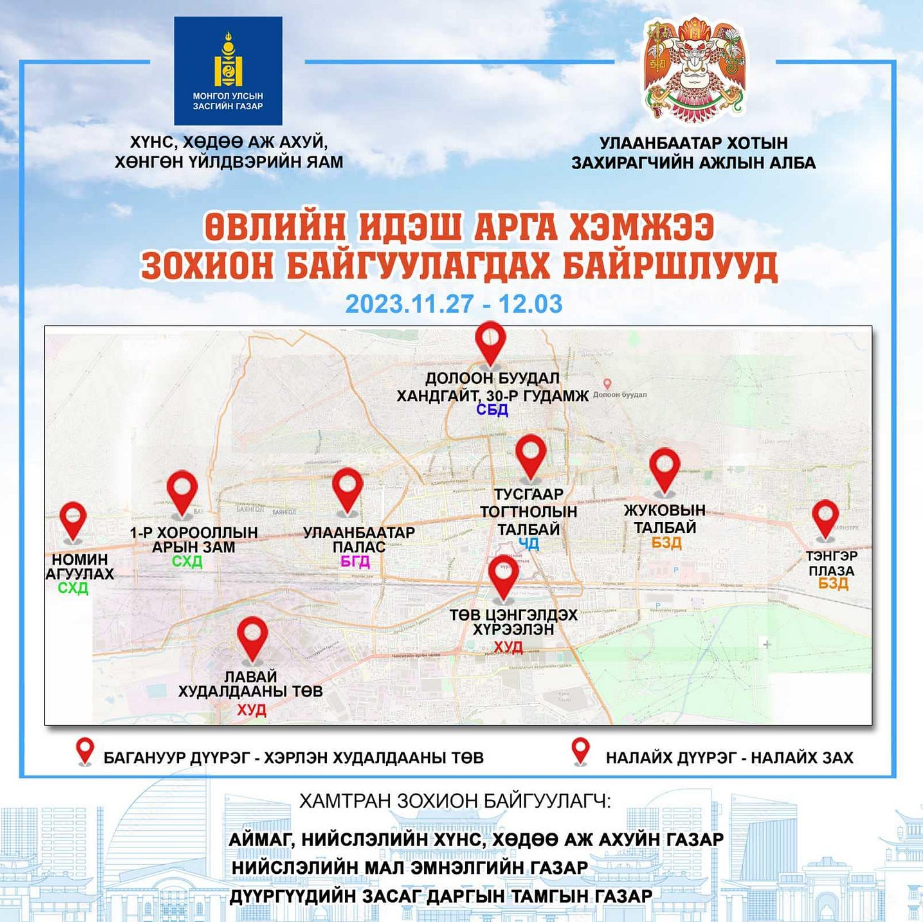 ХХААХҮЯ, НЗДТГ, Улаанбаатар хотын Захирагчийн ажлын алба, холбогдох аймгийн Засаг дарга болон аймаг, нийслэлийн Хүнс, хөдөө аж ахуйн газар хамтран нийслэлийн хүн амын өвлийн хэрэгцээнд зориулан “Өвлийн идэш” арга хэмжээ зохион байгуулж байна. Энэ үеэр гарал үүсэл нь баталгаажсан эрүүл малын мах, сүү, цагаан идээ, орон нутгийн онцлогтой бүтээгдэхүүн болон шинэ ургацын улаан буудайн гурил, цагаан будаа, ургамлын тос зэргийг бөөний үнээр борлуулна.