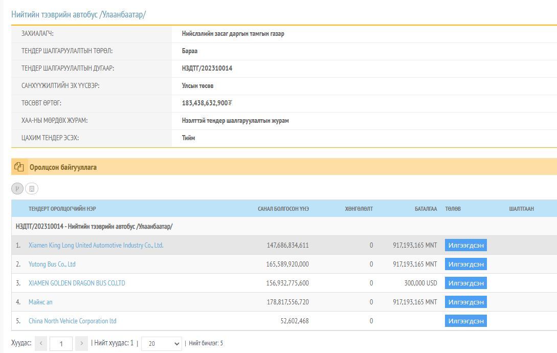Сануулахад, Yutong Bus Co.,Ltd-ийн зүгээс тендерийн баталгааг 917,193,165 төгрөг тендерийн баталгааны санал ирүүлсэн юм. "Yutong Bus" компани 60 жилийн түүхтэй автобус үйлдвэрлэгч компани юм байна. Өнөөдрийн байдлаар тус компани 40 гаруй улс орон, бүс нутагт 87,000 автобус экспортолсон нь дэлхийн зах зээлийн 10 гаруй хувийг эзэлж байна. Энэ оны эхээр л гэхэд Саудын Арабын зах зээлд 550 дээд зэрэглэлийн автобус нийлүүлжээ.