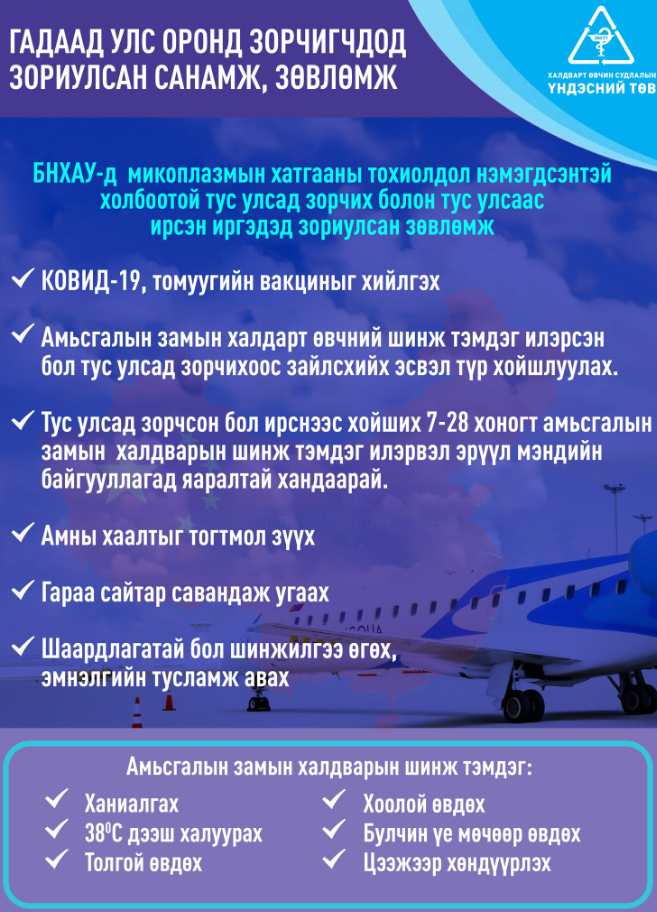 Сүүлийн өдрүүдэд БНХАУ-д микоплазмын хатгааны тохиолдол нэмэгдсэнтэй холбоотой тус улсад зорчих болон тус улсаас ирсэн иргэдэд ХӨСҮТ-ийн зүгээс дараах зөвлөмжийг хүргэж байна.