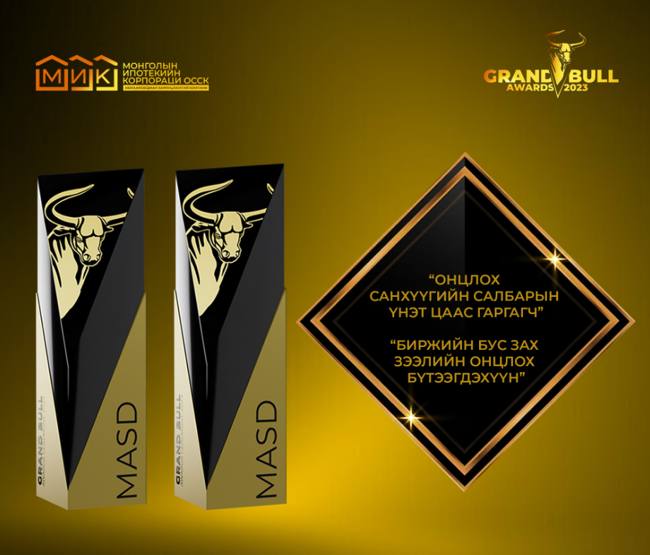 Монголын хөрөнгийн зах зээлийн шилдгүүдийг 5 жилд нэг удаа тодруулдаг “Grand Bull Awards 2023” ёслолын арга хэмжээнээс “Монголын Ипотекийн ОССК” ХХК (МИК) нь “Онцлох санхүүгийн салбарын үнэт цаас гаргагч” болон “Биржийн бус зах зээлийн онцлох бүтээгдэхүүн” номинацид хос шагналын эзэн боллоо.