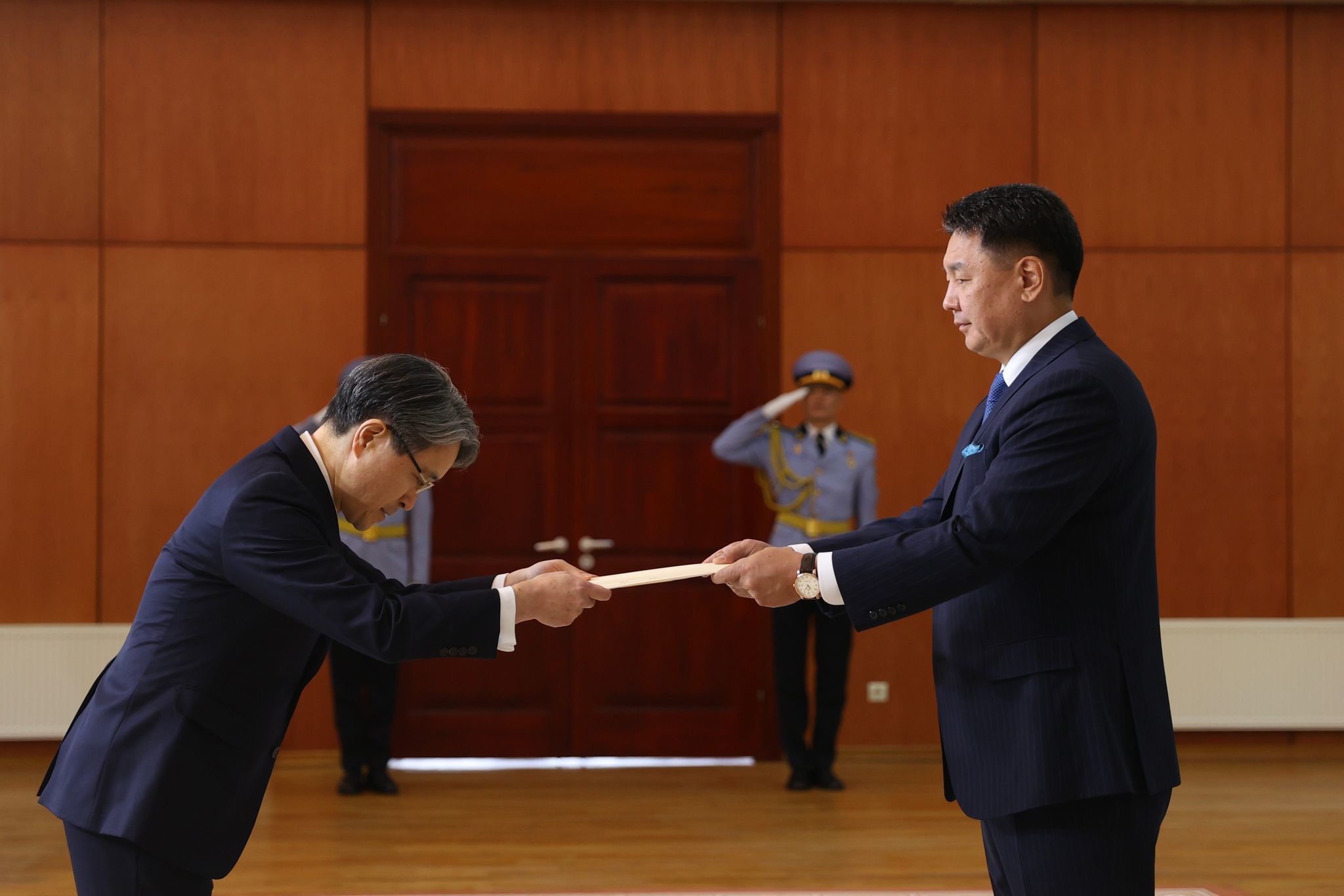 Япон Улсаас Монгол Улсад суух Онц бөгөөд Бүрэн эрхт Элчин сайд Игавахара Масарү Монгол Улсын Ерөнхийлөгч Ухнаагийн Хүрэлсүхэд Итгэмжлэх жуух бичгээ өргөн барив.