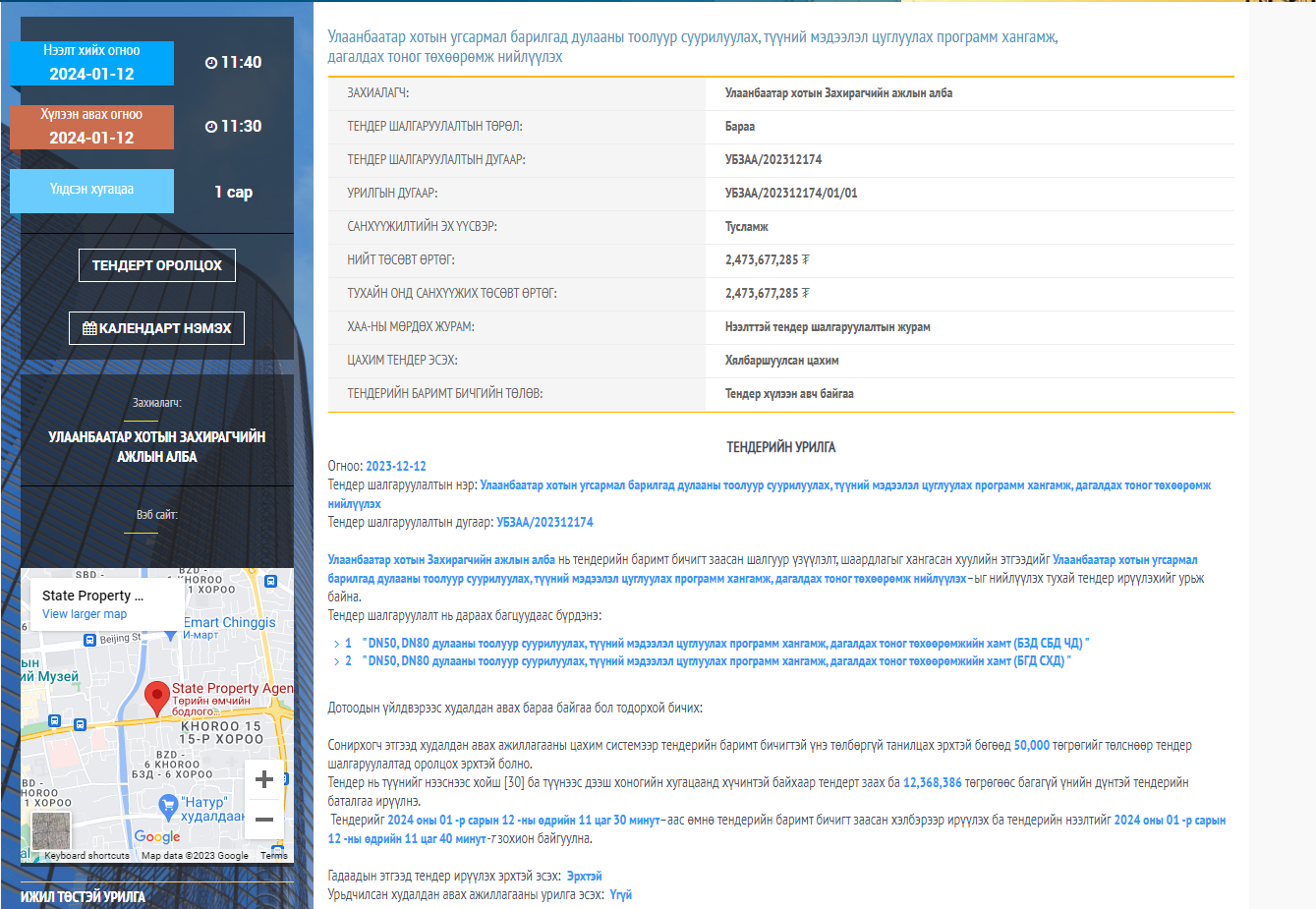 Улаанбаатар хотын Захирагчийн Ажлын Албанаас нийслэлийн угсармал барилгад дулааны тоолуур суурилуулах, түүний мэдээлэл цуглуулах программ хангамж, дагалдах тоног төхөөрөмж нийлүүлэх тендер зарлажээ. Германы олон улсын хамтын ажиллагааны нийгэмлэгийн буцалтгүй тусламжийн 2.4 тэрбум төгрөгөөр нийт 149 тоолуур болон мэдээлэл цуглуулах программ хангамж авахаар тендерийн материалд дурдсан байна.