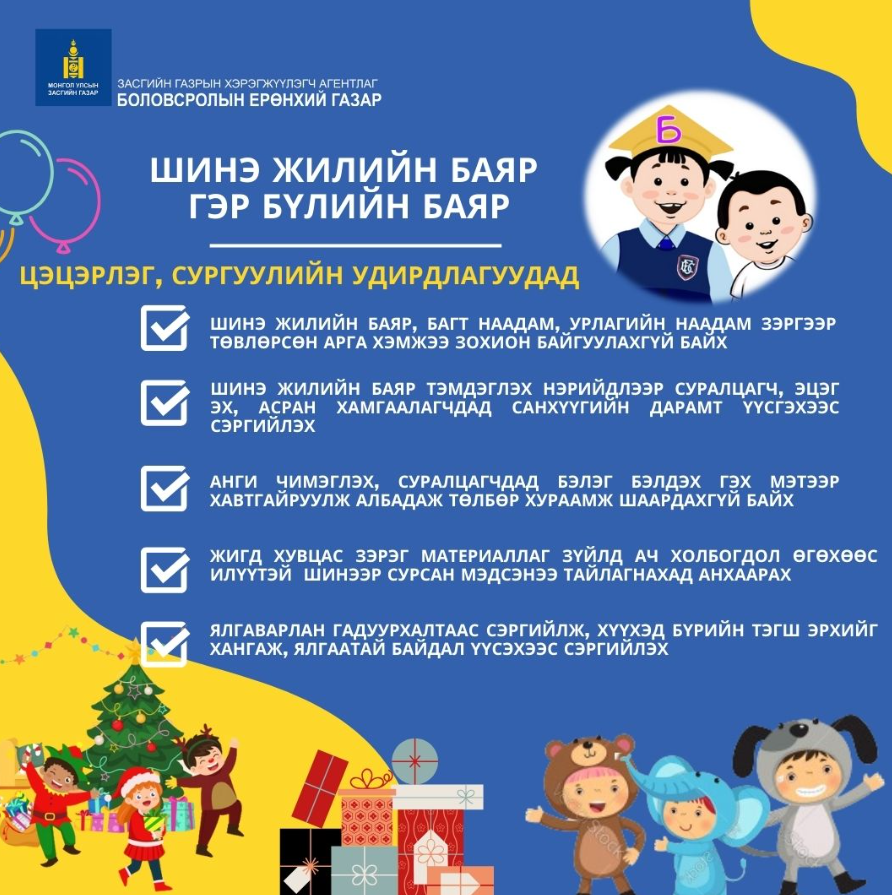 - Шинэ жилийн баяр тэмдэглэх нэрийдлээр суралцагч, эцэг эх, асран хамгаалагчдад санхүүгийн дарамт үүсгэхээс сэргийлэх;