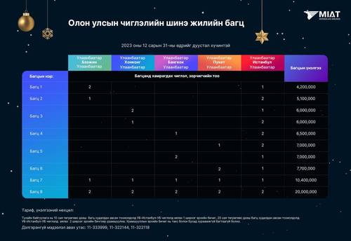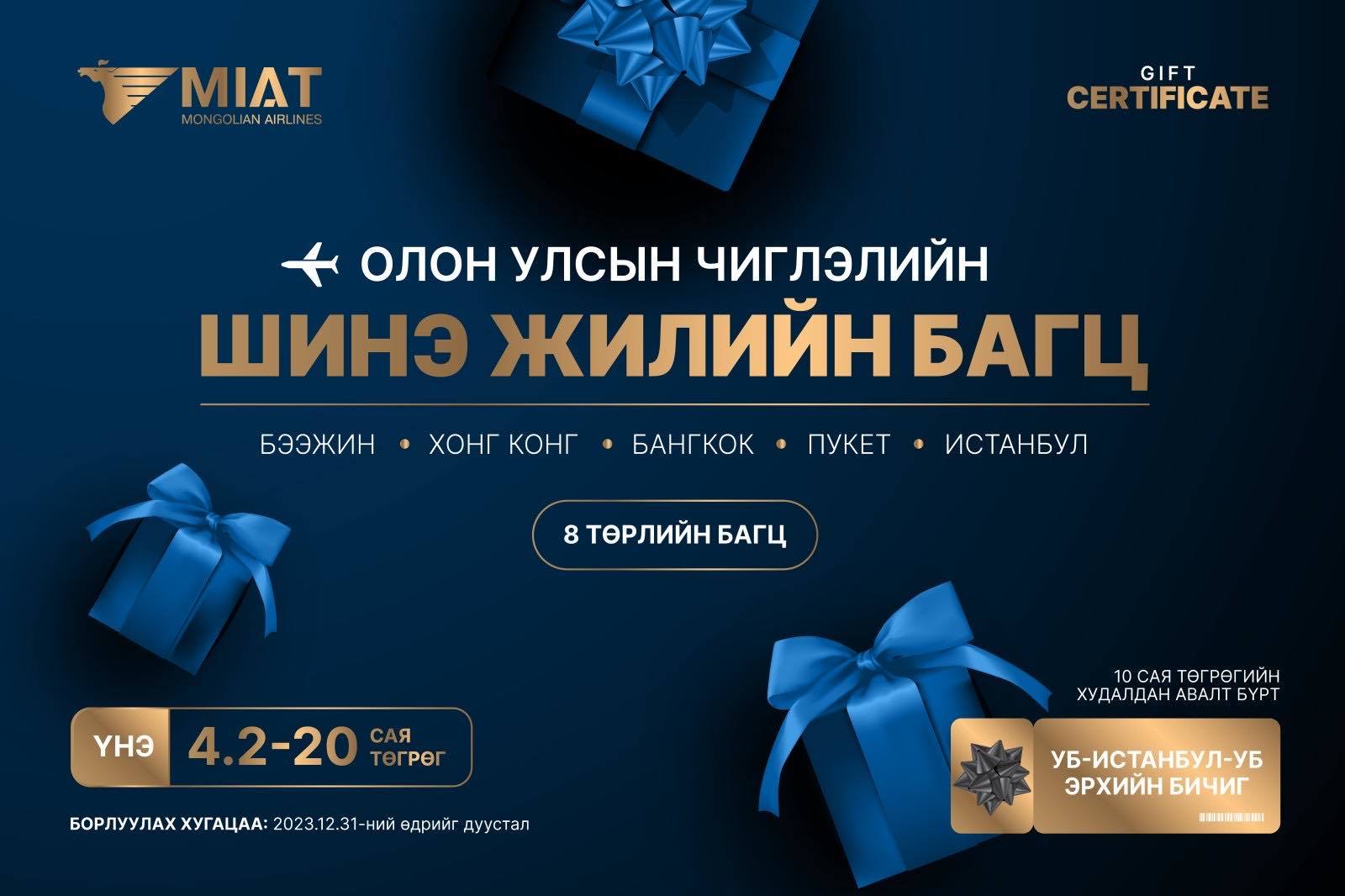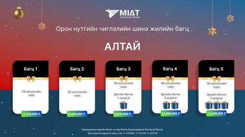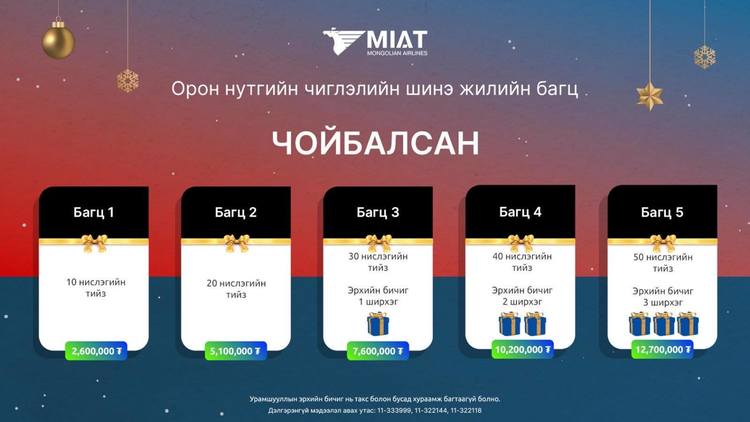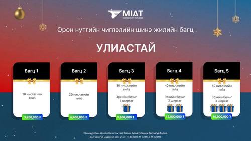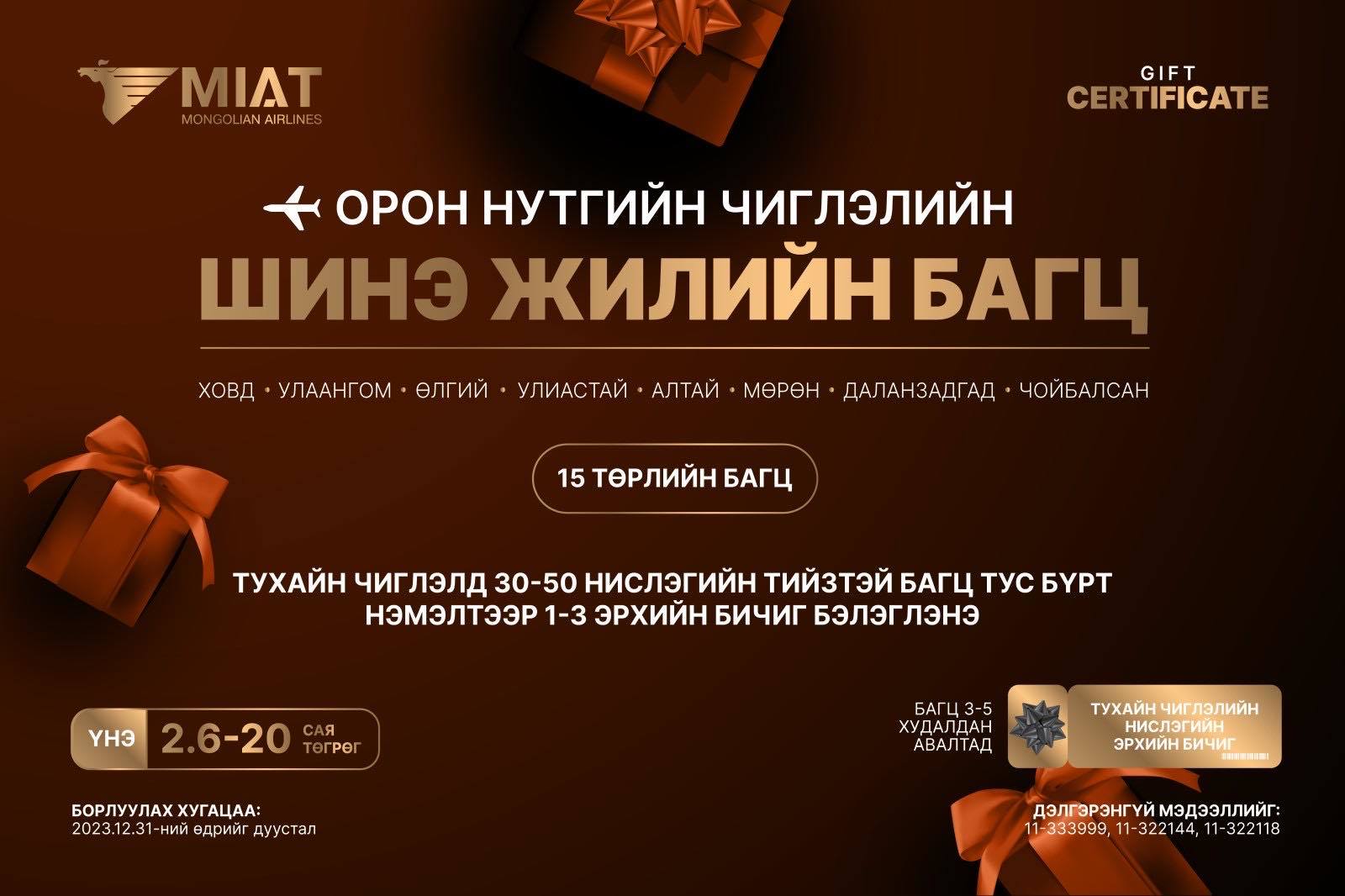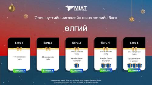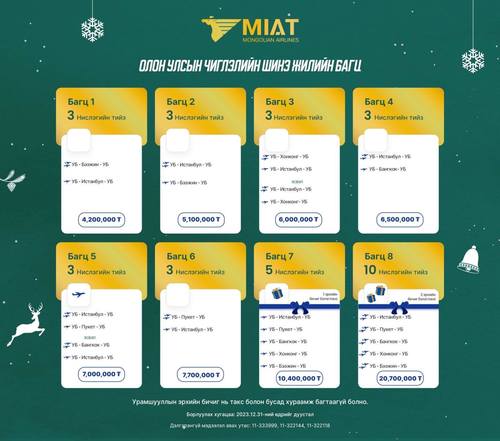 Үндэсний агаарын тээвэрлэгч МИАТ компани айлчлан ирж буй шинэ оноо угтан зорчигч үйлчлүүлэгчдэдээ зориулан нислэгийн багц тийзээр бэлэг барьж байна. Олон улсын болон орон нутгийн нислэгийн тийз гэсэн хоёр төрөлтэй 2,6 – 20 сая төгрөгийн үнэ бүхий бэлгийн багцуудыг 2023 оны 12 дугаар сарын 31-нээс өмнө худалдан авах боломжтой.