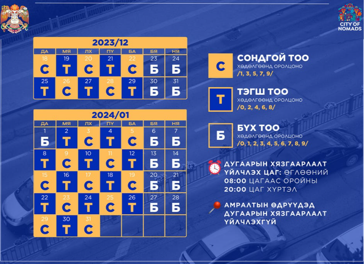 Нийслэлийн Засаг даргын захирамжийн хүрээнд 2023 оны арванхоёрдугаар сарын 18-нас 2024 оны нэгдүгээр сарын 31 хүртэл иргэдийн тээврийн хэрэгсэл улсын дугаарын тэгш, сондгой тоогоор хязгаарлаж замын хөдөлгөөнд оролцож байна.