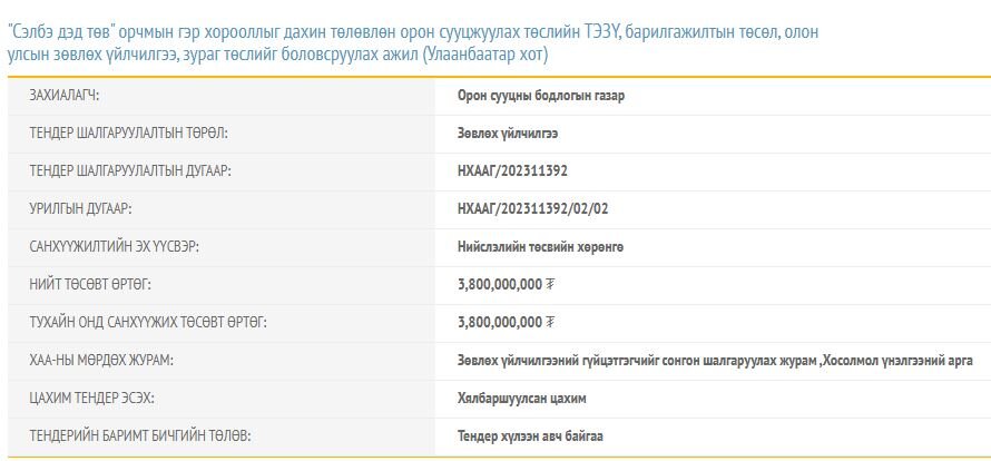 Тэгвэл Сэлбэ дэд төвийн ажлыг эхлүүлэхээр тендер зарлажээ. Тодруулбал, Сэлбэ дэд төв" орчмын гэр хорооллыг дахин төлөвлөн орон сууцжуулах төслийн ТЭЗҮ, барилгажилтын төсөл, олон улсын зөвлөх үйлчилгээ, зураг төслийг боловсруулах ажлыг 3.8 тэрбум төгрөгөөр хийлгэхээр болсон байна. Орон сууцны бодлогын газрын захиалгаар хийгдэх ажлын санхүүжилт нь нийслэлийн төсөв байх юм. Ийнхүү хотын шинэ дарга гэр хорооллыг орон сууцжуулах төлөвлөгөөгөө хэрэгжүүлэхээр ажлаа эхлүүллээ.