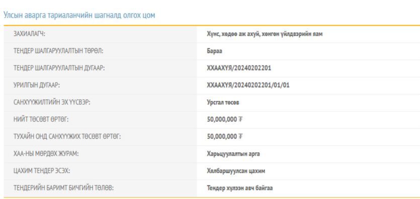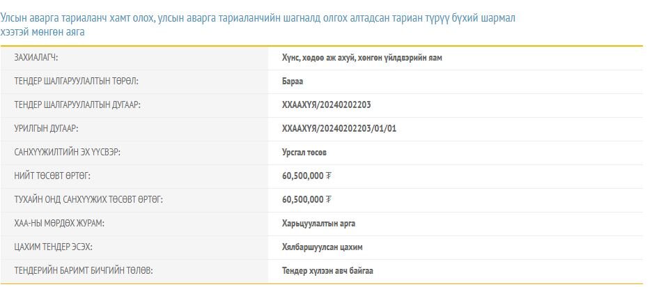 Мөн Улсын аварга тариаланч хамт олох, улсын аварга тариаланчийн шагналд олгох алтадсан тариан түрүү бүхий шармал хээтэй мөнгөн аягыг 60 сая төгрөгөөр худалдан авна. Тендерийн баримт бичигт 55 мөнгөн аяга авна хэмээн тусгажээ. Нэг ширхэг мөнгөн аягийг 1.1 сая төгрөгөөр худалдан авахаар төлөвлөсөн гэсэн үг