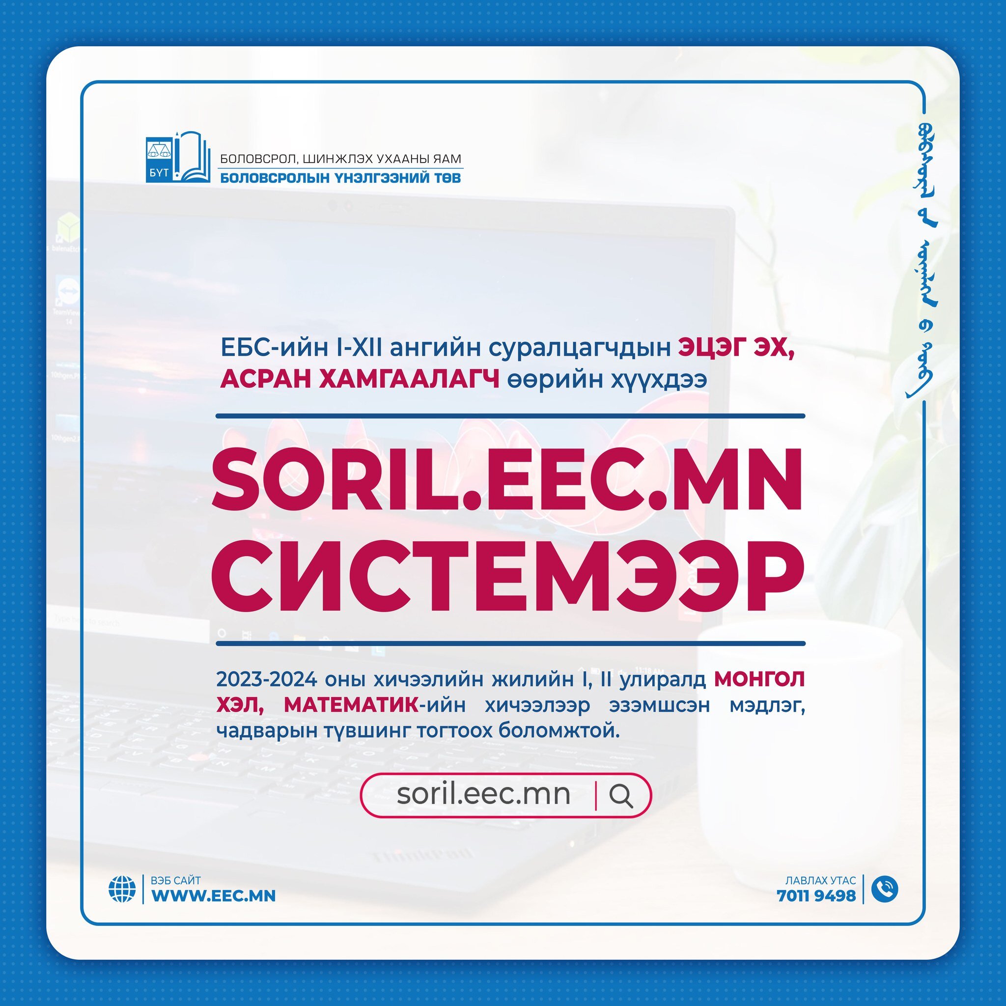 Тодруулбал, ЕБС-ийн I-XII ангийн суралцагчдад зориулсан цахим сорилын систем /soril.eec.mn/-д өөрийгөө сорихыг хүссэн суралцагч бүр регистрийн дугаараараа нэвтрэн орж, хувийн мэдээллээ баталгаажуулан, Монгол хэл, Математикийн хичээлээр I, II улиралд эзэмшсэн мэдлэг, чадварын түвшнээ тодорхойлох боломжтой болж байгаа аж.
