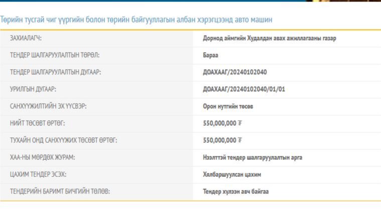 Төсвийн жил эхэлж төрийн байгууллагууд худалдан авалтуудаа зарлаж эхлээд байна. Тухайлбал, Дорнод аймгийн Засаг дарга, аймгийн Засаг даргын дэргэдэх Худалдан авах ажиллагааны газраас Төрийн тусгай чиг үүргийн болон төрийн байгууллагын албан хэрэгцээнд авто машин авах тендер зарласан байна.