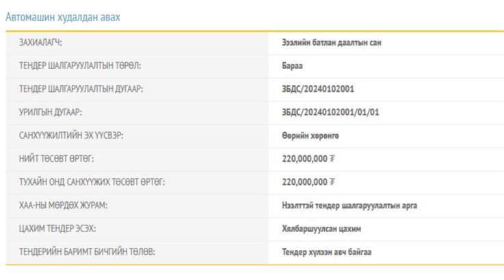 Тус сангаас энэ сарын 19-нд нэг ширхэг машиныг 220 сая төгрөгөөр худалдан авахаар тендер зарласан байна. Тендерийн баримт бичигт тусгаснаар 220 сая төгрөгөөр 2023 онд үйлдвэрлэсэн туулах чадвар сайдтай машин худалдан авна гэжээ. Мөн суудал нь халдаг, хөрдөг байх, хамгаалалтын хуулга, тентэй байх, урд хойд зай мэдрэгч, лед гэрэлтэй, арьсан суудалтай зэрэг 28 шаардлагыг дурджээ. Ийнхүү нэг яамны харъяанд байдаг төсөвт үйлдвэрийн газар 220 сая төгрөгийг цоо шинэ загварын машин худалдан авахад зарцуулах нь