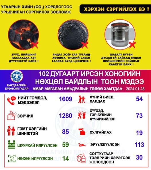 Цагдаагийн байгууллагын 102 тусгай дугаарт 2024 оны 01 дүгээр сарын 28-ны өдөр нийт 1609 дуудлага, мэдээлэл бүртгэгдсэнээс зөрчлийн шинжтэй 1280, гэмт хэргийн шинжтэй 85 дуудлага, мэдээлэл байна.