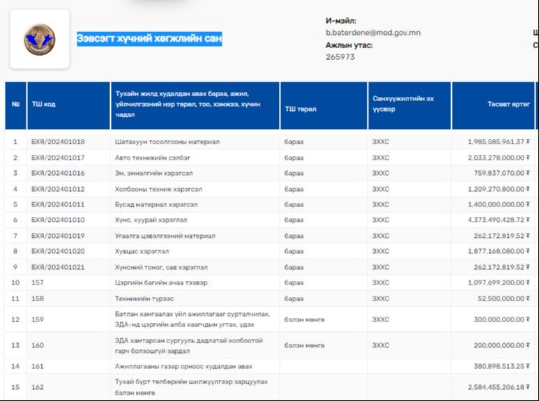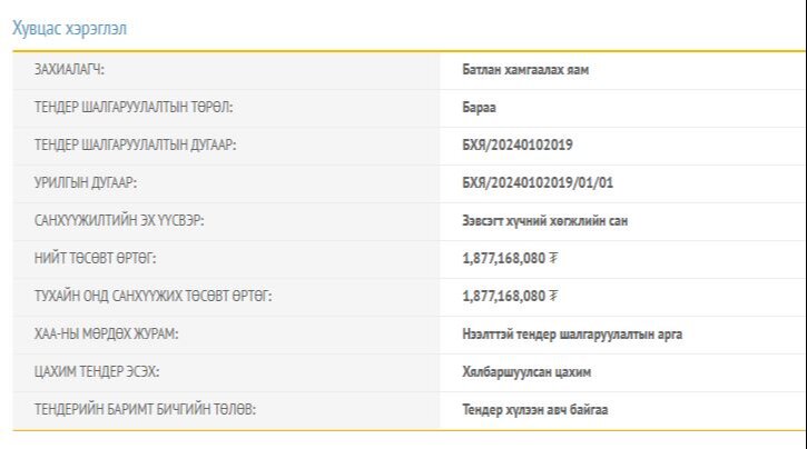 Г.Сайханбаяр төсвийн захирагчтай Батлан хамгаалах яам өчигдөр 1.8 тэрбум төгрөгийн төсөвт өртөгтэй тендер зарласан байна. Энэхүү хөрөнгийг Зэвсэгт хүчний хөгжлийн сангаас гаргахаар болсон байна. Энэ хөрөнгөөр аранз, гутал, биеийн тамирын хувцас, бусад хэрэглэл, хөдөлмөр хамгааллын хувцас, хамгаалах хэрэгсэл, майхан худалдан авах юм.