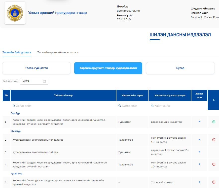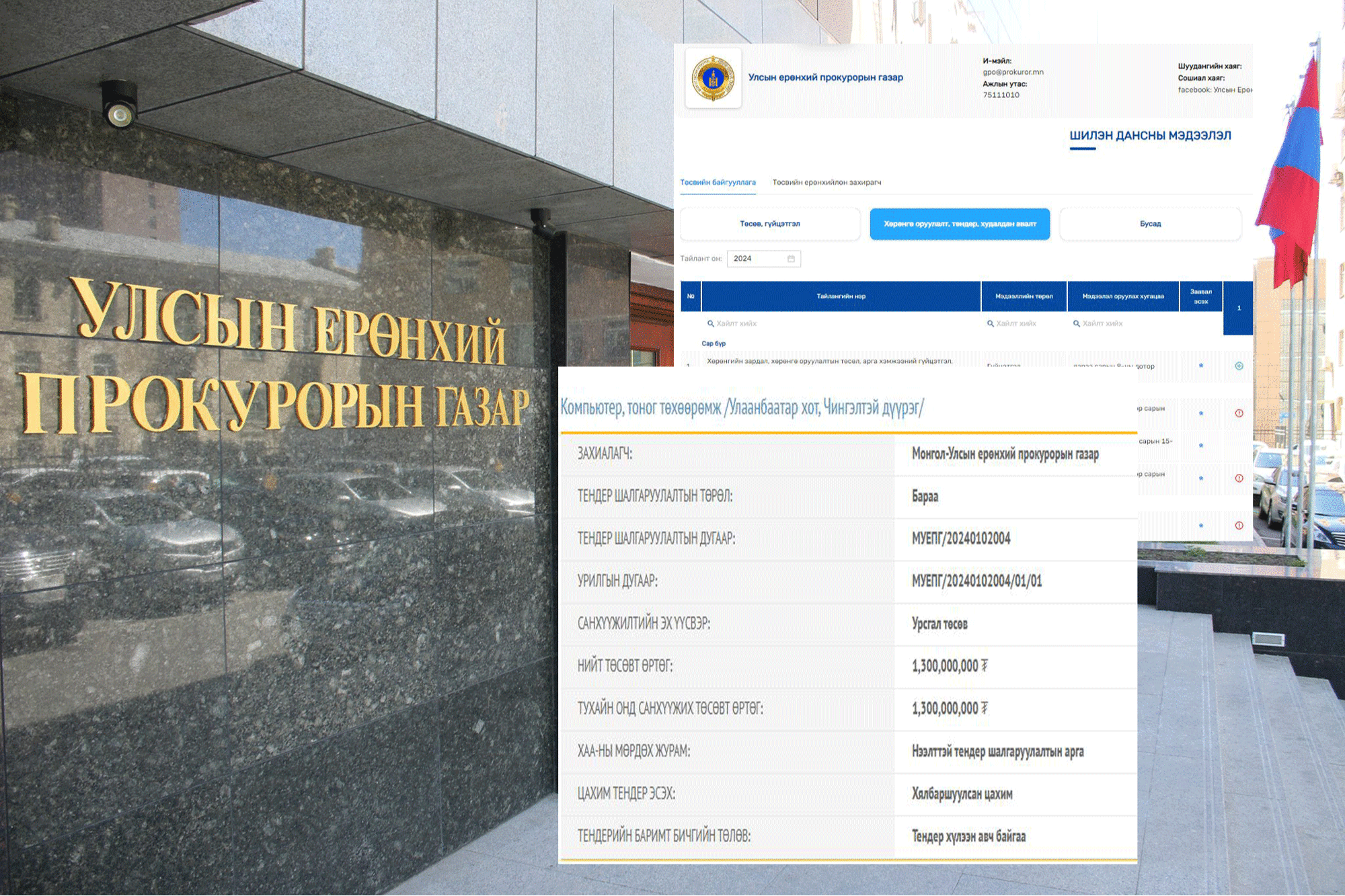Улсын ерөнхий прокурорыг Б.Жаргалсайхан тэргүүлдэг. Тус байгууллагын хувьд 2024 оны төсвийн жил эхэлсэн ч худалдан авах төлөвлөгөө орлого зарлагын мэдээллээ ШИЛЭН ДАНСАНДАА оруулаагүй байна. Нэг үгээр тус байгууллагын төсөв төлөвлөгөө одоогоор нууц байна.