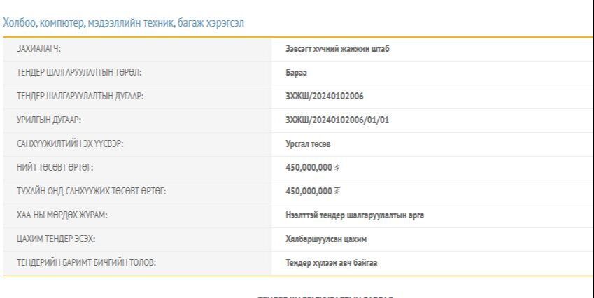 Тэгвэл дахин холбоо, компютер, мэдээллийн техник, багаж хэрэгсэл авах тендер зарласан байна. Урсгал төсвөөр санхүүжигдэх энэхүү худалдан авалт нь 450 сая төгрөгийн төсөвт өртэй байна. Энэ хөрөнгөөр зөөврийн компьютер 25, суурин компьютер 25, холбоо, мэдээллийн техник хэрэгсэл, багаж, дотуур электрон АТС-ын сэлбэг, хэрэгсэл худалдан авах юм. Эдгээрийг бүгдийг БЗД-ийн 19-р хороо Зэвсэгт хүчний 189 дүгээр ангид нийлүүлэхээр төлөвлөжээ.