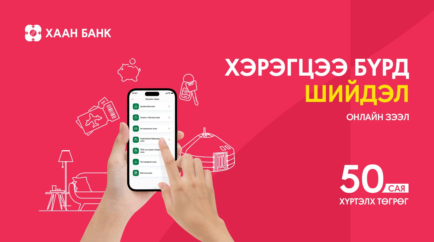 Та ердөө 3 минут зарцуулаад өөрт тохирсон зээлийн үйлчилгээг ХААН Банкны аппликэйшнээс хүссэн цагтаа, хаа байгаа газраасаа авах боломжтой.
