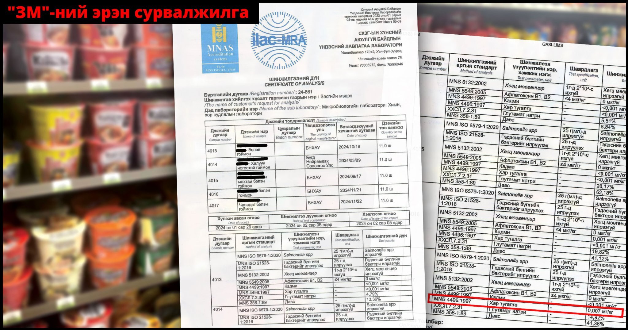 Шинжилгээгээр гэдэсний бүлгийн бактери, хөгц мөөгөнцөр, афлатоксин B1, B2 кадми болон хар тугалга, Глутамат натри, нэг уут амтлагчинд агуулагдах давсны хэмжээг нягталжээ. Ингэхэд Глутамат натригийн хэмжээ харилцан адилгүй байгааг та бүхэн дээрх шинжилгээний хариунаас харж байгаа байх. Тэгвэл энэ нь аливаа хүнсний бүтээгдэхүүнд амт оруулах зорилгоор хийдэг нэг ёсны химийн бүтээгдэхүүн юм байна. Аливаа бүтээгдэхүүн ямар нэгэн шалтгаанаар амтаа алддаг бөгөөд үүнийг нөхөхийн тулд хиймэл амт оруулагч ашигладаг. Мөн найрлагад нь огт ороогүй зүйлийн амтыг ч хиймлээр оруулж өгдөг ажээ. Глутамат натриг Монголд “үүсүү” гэж нэрлэдэг, Е621 гэсэн олон улсын кодтой, техникийн шаардлагагүй гэж үздэг, үйлдвэрлэгчийн зохистой дадал гэсэн нэршлээр хэрэглээнд нэвтэрсэн ажээ. Энэ нь үүсүүг тухайн бэлэн гоймонг үйлдвэрлэгч компани өөрсдийн хүссэн үр дүнд хүрэх хамгийн бага хэмжээгээр нь хийдэг гэсэн үг юм байна. ДЭМБ-ын зөвлөснөөр үүсүүг хэт их хэрэглэх нь донтуулах сөрөг нөлөөтэй гэж анхааруулжээ. ДЭМБ-аас Е621 кодтой глутамат натриг хүүхдийн хоол тэжээлд хэрэглэхийг хориглосон байдаг аж. Учир нь энэхүү давс нь харшилттай хүмүүсийн астма, ногооны харшлыг хөдөлгөж, толгой өвтгөж болзошгүй. Хэтрүүлж хэрэглэсэн тохиолдолд зүрх бэлбэгнэх, дотор муухайрах, цээжээр өвдөх шинж тэмдэг илэрдэг гэж онцолсон байна. Түүнчлэн БНХАУ-ын эрүүл мэндийн сайт дээр бичсэнээр үүсүү нь ходоодны өвчлөлийн гол буруутан гэжээ. Учир нь Хятадад сүүлийн жилүүдэд тайлагдашгүй өвчнүүд байнга гарах болжээ. Үүнийг судлаад үзтэл амтлагчийг хэмжээ хязгааргүй хэрэглэдэг хятад хоолны газруудад очсон хүмүүст энэ өвчний шинж тэмдэг илэрч байсан гэсэн мэдээлэл байна. Манай улсын хувьд хэдийгээр техникийн үзүүлэлт байхгүй гэж байгаа ч олон улсад ямар стандарт мөрддөг, энэхүү давс буюу үүсүүг ямар бүтээгдэхүүнтэй жишиж, харьцуулж зохистой хэмжээг гаргадаг тухай нь тодорхой мэдээлэл өгөх хүн ЭМЯ, ХХААХҮЯ-нд байхгүй байгаа нь өөрөө асуудал болж байна. Албаны хүний хэлж буйгаар уг нь ХХААХҮЯ-нд технологийн байцаагч гэсэн орон тоо заавал байх ёстой бөгөөд тухайн байцаагч нь энэхүү глутамат натрийн зохистой хэмжээг тогтоож, хяналт тавих үүрэгтэй гэв. Гэвч бид тухайн яаманд удаа дараа хүсэлт тавьж, хандсан боловч энэхүү мэргэжилтэн байдаг эсэх болоод глутамат натрийн зохистой хэмжээг хэрхэн тодорхойлсон, ямар хяналт тавьдаг тухай мэдээлэл өгсөнгүй. Үүнээс харахад Монголд хүнсний аюулгүй байдалд хэрхэн итгэх вэ. Бидний өдөр тутмын хэрэглэж буй хүнс, хоолонд донтуулагч бодис дураараа авирлаж байгааг мэдсээр байж, эрүүл мэндээрээ хохироод суух нь зөв үү гэсэн асуултад харьяа яам, албаны хүмүүс, хамгийн гол нь эрүүл ахуйн байцаагчаас хариулт нэхмээр байна.