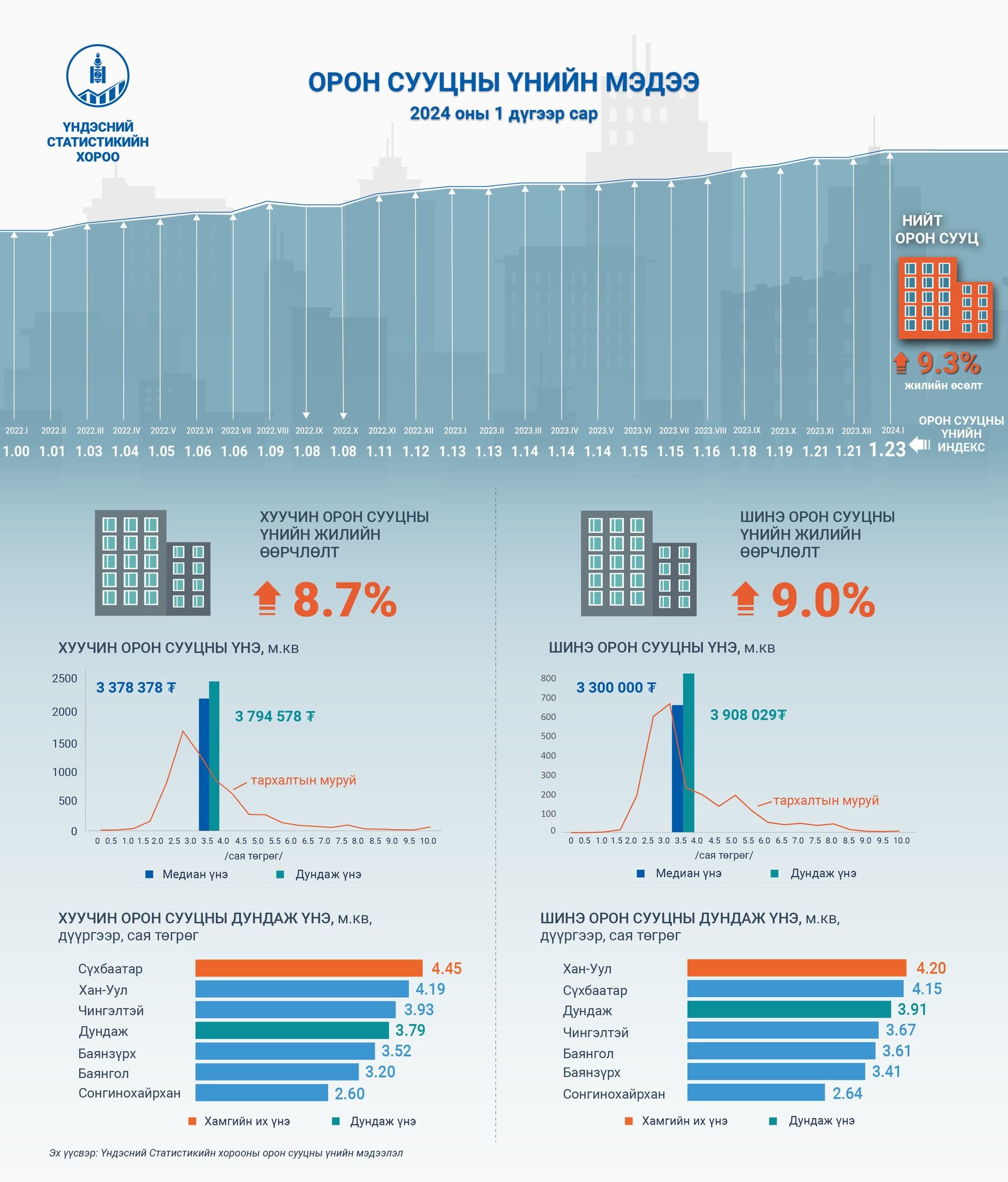 Улаанбаатар хотод 2024 оны 01 дүгээр сарын байдлаар орон сууцны үнэ өмнөх оны мөн үеэс 9.3 хувиар, өмнөх сараас 1.4 хувиар өссөн байна. Нэгдүгээр сард шинэ орон сууцны метр квадрат талбайн дундаж үнэ 3.91 сая төгрөг болж, өмнөх оны мөн үеэс 9.0 хувиар өсчээ.
