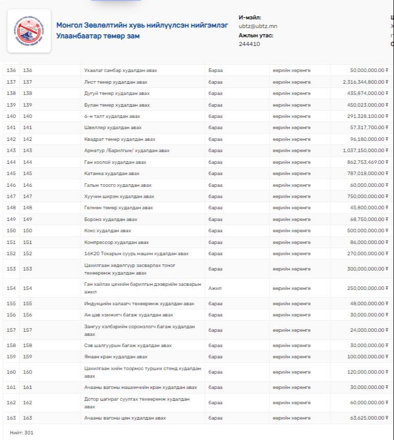 Монгол Зөвлөлтийн хувь нийлүүлсэн нийгэмлэг Улаанбаатар төмөр зам 2024 оны төсвийн жилд 301 төрлийн худалдан авалт хийхээр төлөвлөсөн байна.