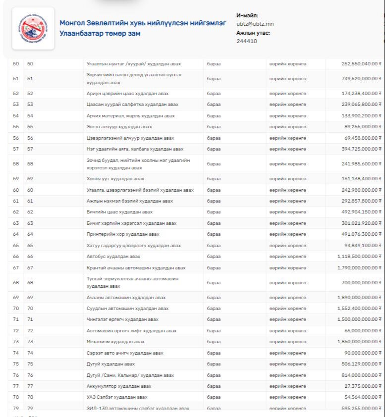 Улаанбаатар төмөр зам ХНН-ийнхний хувьд нийт воганы засвар, сэлбэг хэрэгсэлд багагүй хөрөнгийг зарцуулахаар төлөвлөсөн байна. Мөн зорчигчийн вагон депод цай, кофе худалдан авахад НЭГ ТЭРБУМ төгрөг, малын мах худалдан авахад 2.4 тэрбум төгрөг зарцуулахаар төлөвлөсөн нь хамгийн өндөр дүнтэй худалдан авалтууд байна.