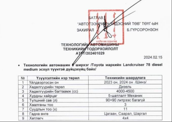 Тэгвэл тус худалдан авалтынхаа тендерийг зарласан байна. Тендерийн баримт бичигт технологийн автомашин буюу TOYOTA маркийн Landcruiser 78 машинтай дүйцэхүйц байхаар тусгажээ. Автотээврийн үндэсний төвийн ТӨҮГ-ын захирал Б.Гүрсоронзонгийн гарын үсэг бүхий уг баримт бичигт 725 сая төгрөгөөр худалдан авах юм. Уг таван машин нь 2023, 2024 онуудад үйлдвэрлэсэн байх шаардлага тавьсан байна.