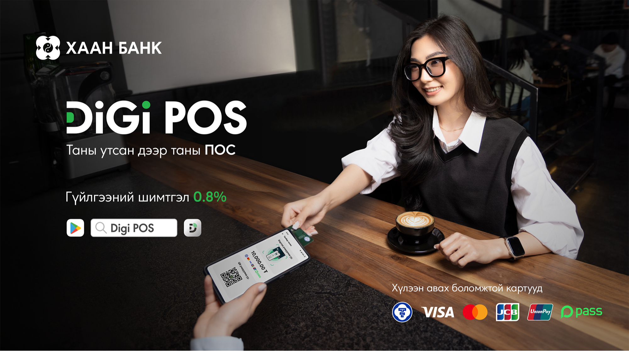 Гар утасны NFC-ээр дамжуулан картын контактлесс буюу зайнаас унших технологийг ашиглан хэзээ ч, хаана ч төлбөр тооцоогоо хялбар хүлээн авах боломжийг бүрдүүлсэн цахим ПОС буюу DIGI POS аппликэйшнийг ХААН Банк өнөөдрөөс үйлчилгээндээ нэвтрүүлээд байна.
